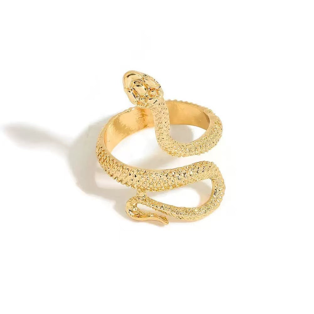 خاتم ذهبي مميز على شكل ثعبان ملفوف، مزين بنقش حرشفي. يلتف تصميم الثعبان بسلاسة حول الإصبع، وينتهي برأس ثعبان بارز محفور عليه عين ونقش حرشفي، لإطلالة جريئة ومميزة.