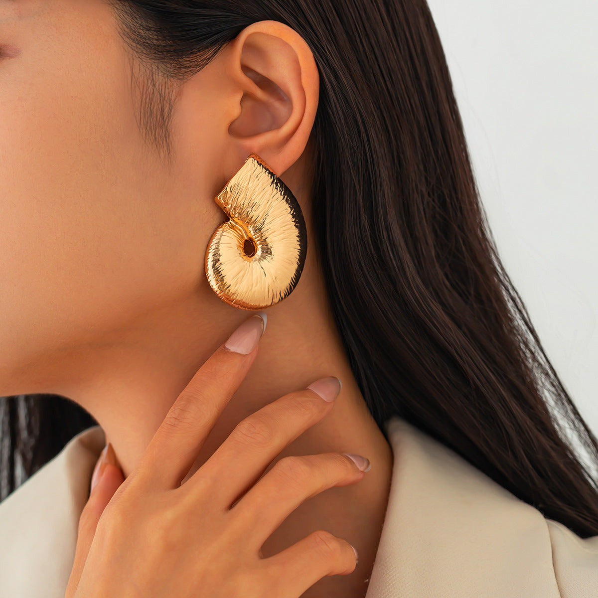 تتميز هذه الأقراط الجريئة بتصميم حلزوني فريد مستوحى من الأصداف، بلمسة نهائية لامعة ومزخرفة تعكس الضوء بشكل جميل. شكلها المنحوت يضفي لمسة فنية، مما يجعلها القطعة المثالية لإضفاء لمسة راقية على الإطلالات الكاجوال والأنيقة. خفيفة الوزن وجذابة، تجسد الأناقة العصرية بلمسة من الأناقة الطبيعية.