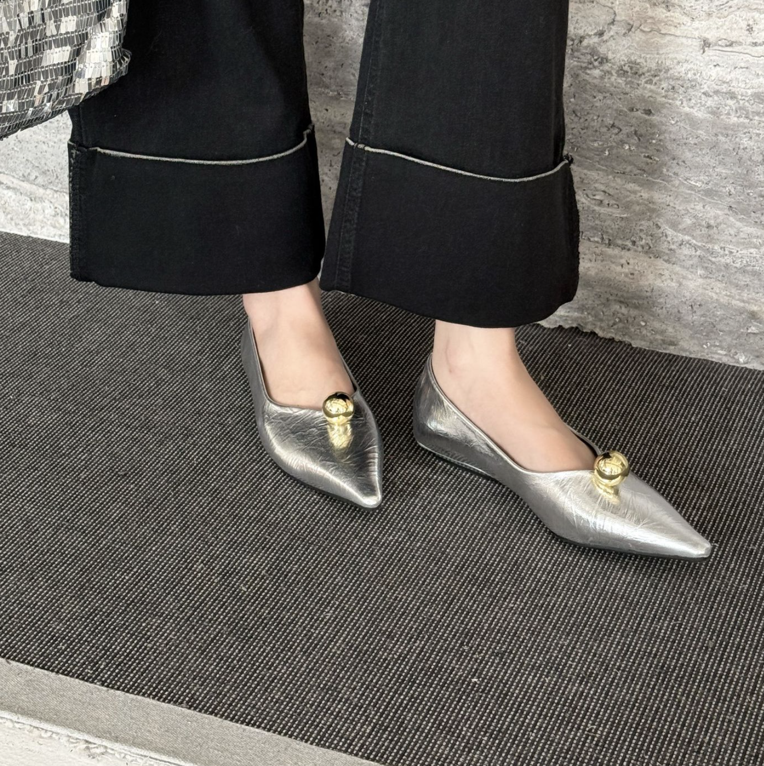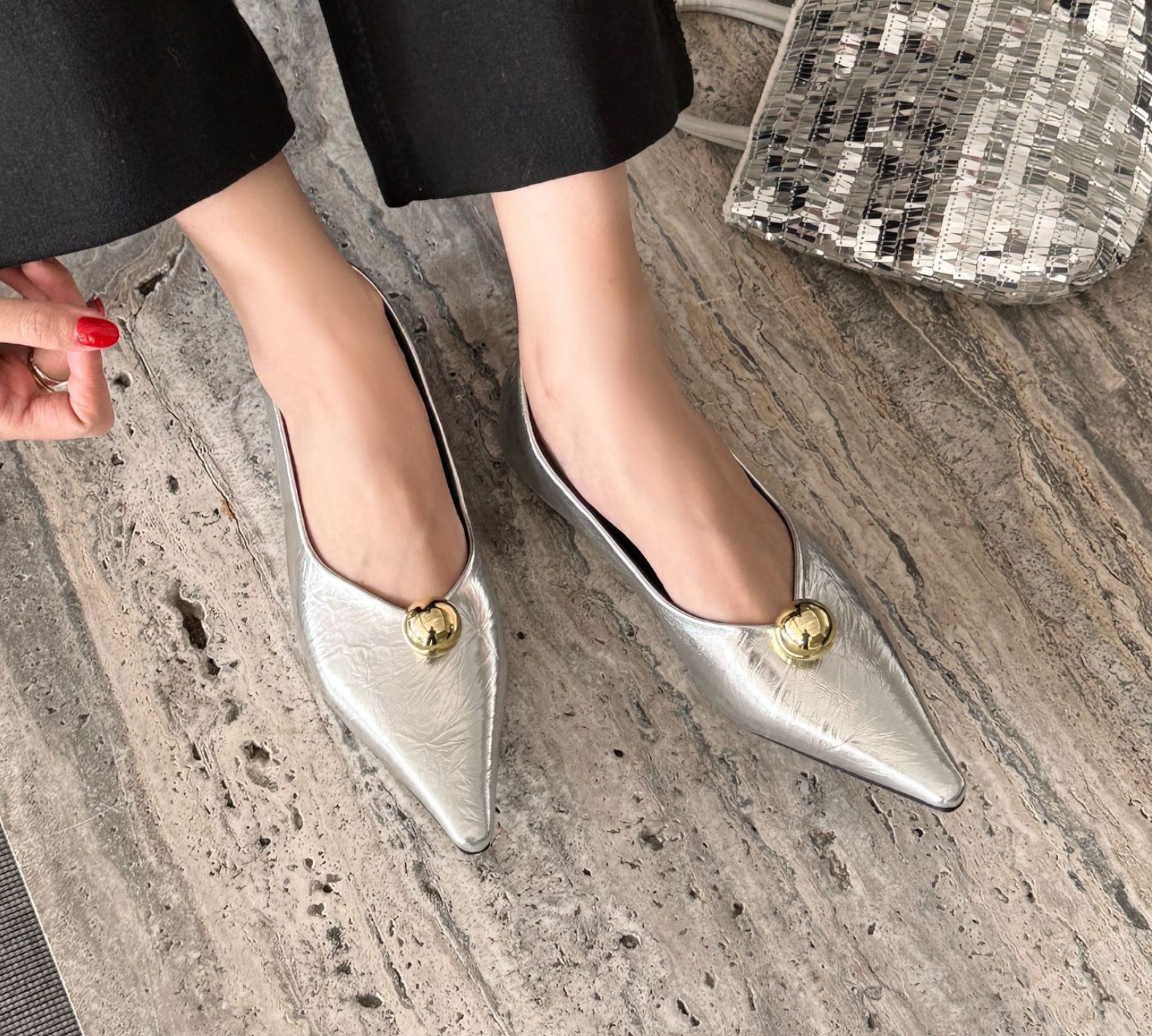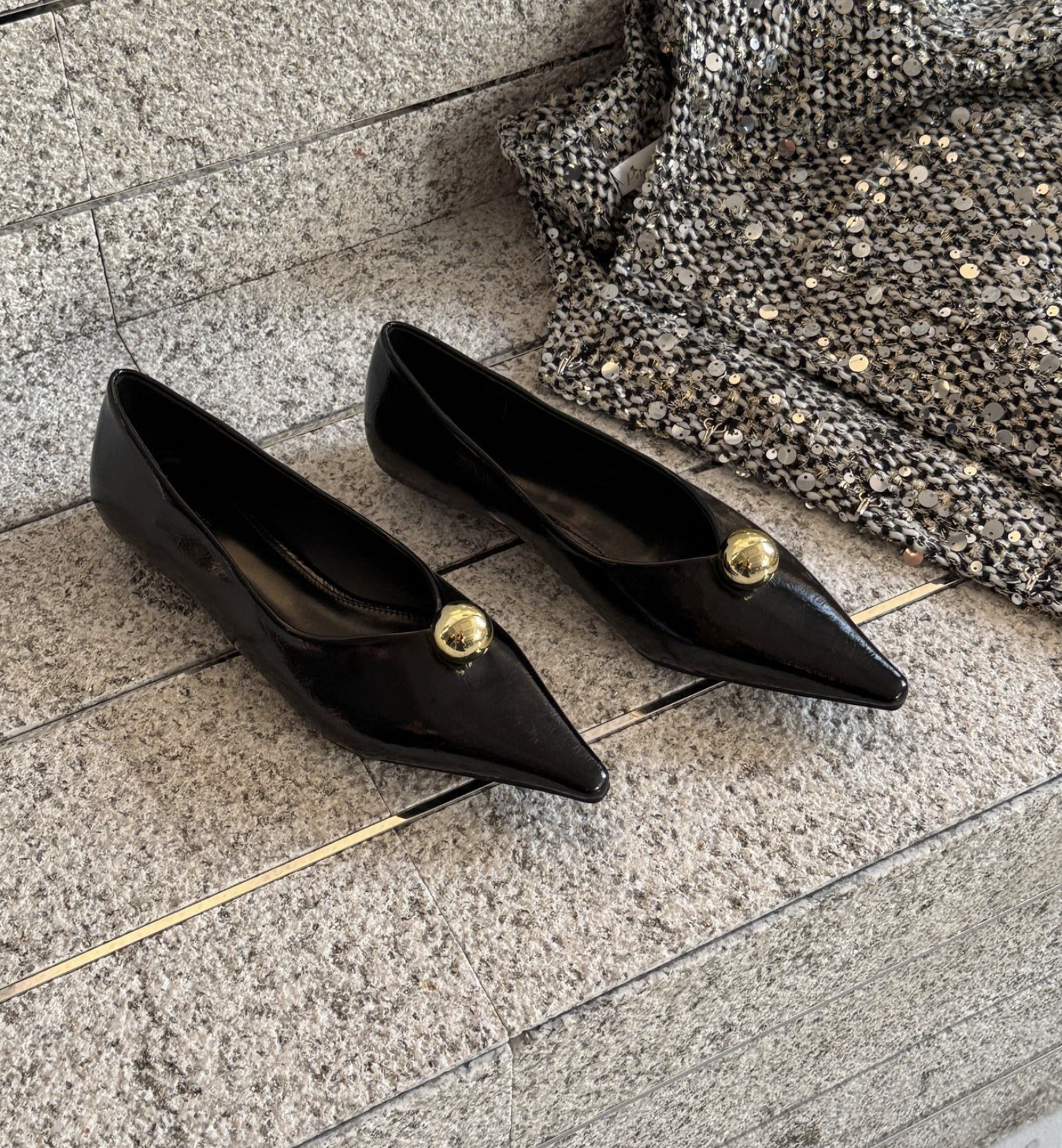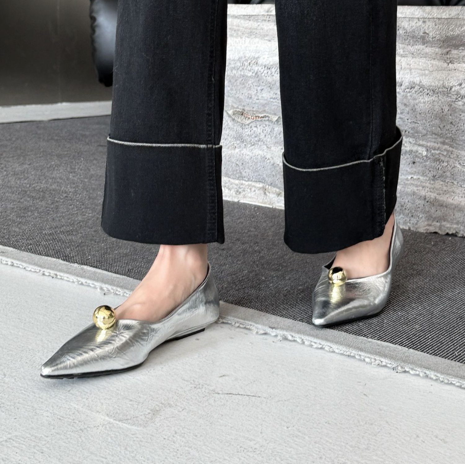 انطلقي نحو أناقة خالدة مع هذا الحذاء الأسود المسطح بمقدمة مدببة. مصنوع من جلد لامع لامع، يتميز هذا الحذاء الأنيق بمقدمة مدببة حادة تُطيل القدم لإطلالة أنيقة. ويبرز قبة ذهبية جريئة تُزين مقدمة الحذاء، مما يُضفي لمسة من الأناقة والرقي العصري. صُمم هذا الحذاء ليجمع بين الراحة والأناقة، ونعله البسيط يُتيح ارتداءً سهلاً من النهار إلى الليل. مثالي للارتداء مع البناطيل الرسمية أو الفساتين أو ملابس السهرة الأنيقة، إنه الخيار الأمثل لإطلالة فاخرة وبسيطة.