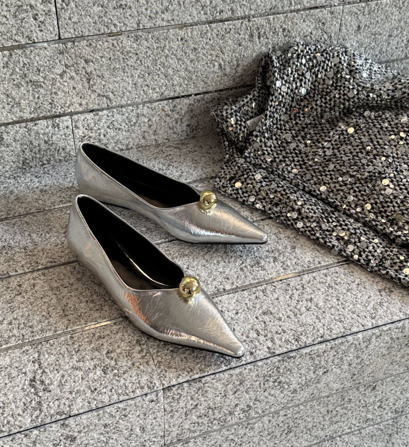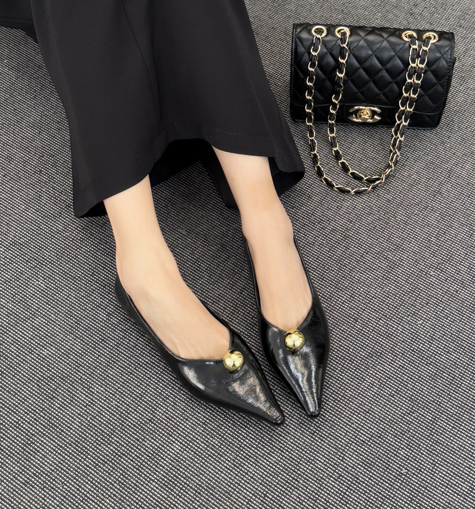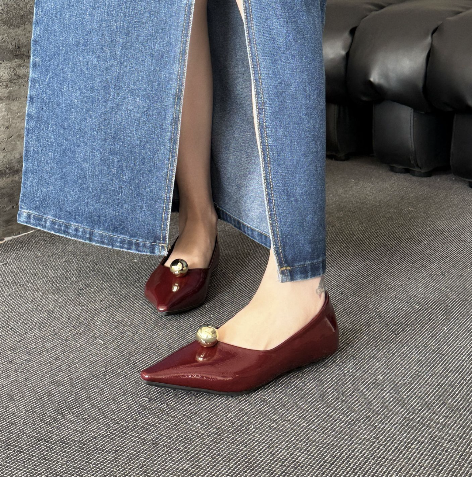 انطلقي نحو أناقة خالدة مع هذا الحذاء الأسود المسطح بمقدمة مدببة. مصنوع من جلد لامع لامع، يتميز هذا الحذاء الأنيق بمقدمة مدببة حادة تُطيل القدم لإطلالة أنيقة. ويبرز قبة ذهبية جريئة تُزين مقدمة الحذاء، مما يُضفي لمسة من الأناقة والرقي العصري. صُمم هذا الحذاء ليجمع بين الراحة والأناقة، ونعله البسيط يُتيح ارتداءً سهلاً من النهار إلى الليل. مثالي للارتداء مع البناطيل الرسمية أو الفساتين أو ملابس السهرة الأنيقة، إنه الخيار الأمثل لإطلالة فاخرة وبسيطة.