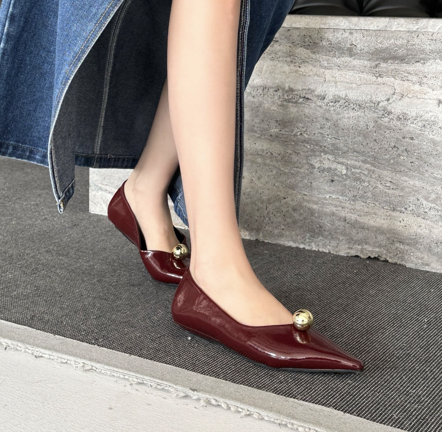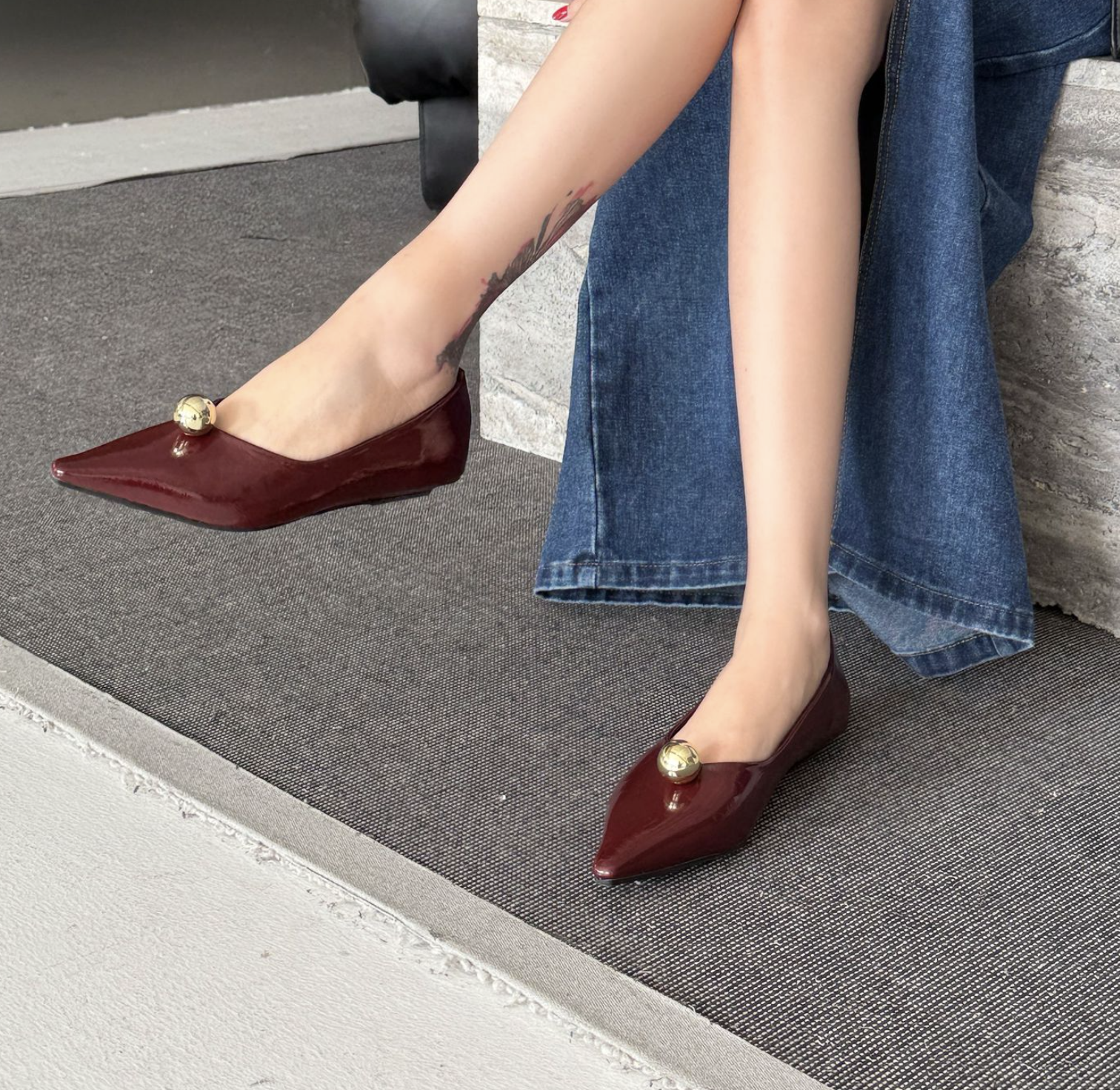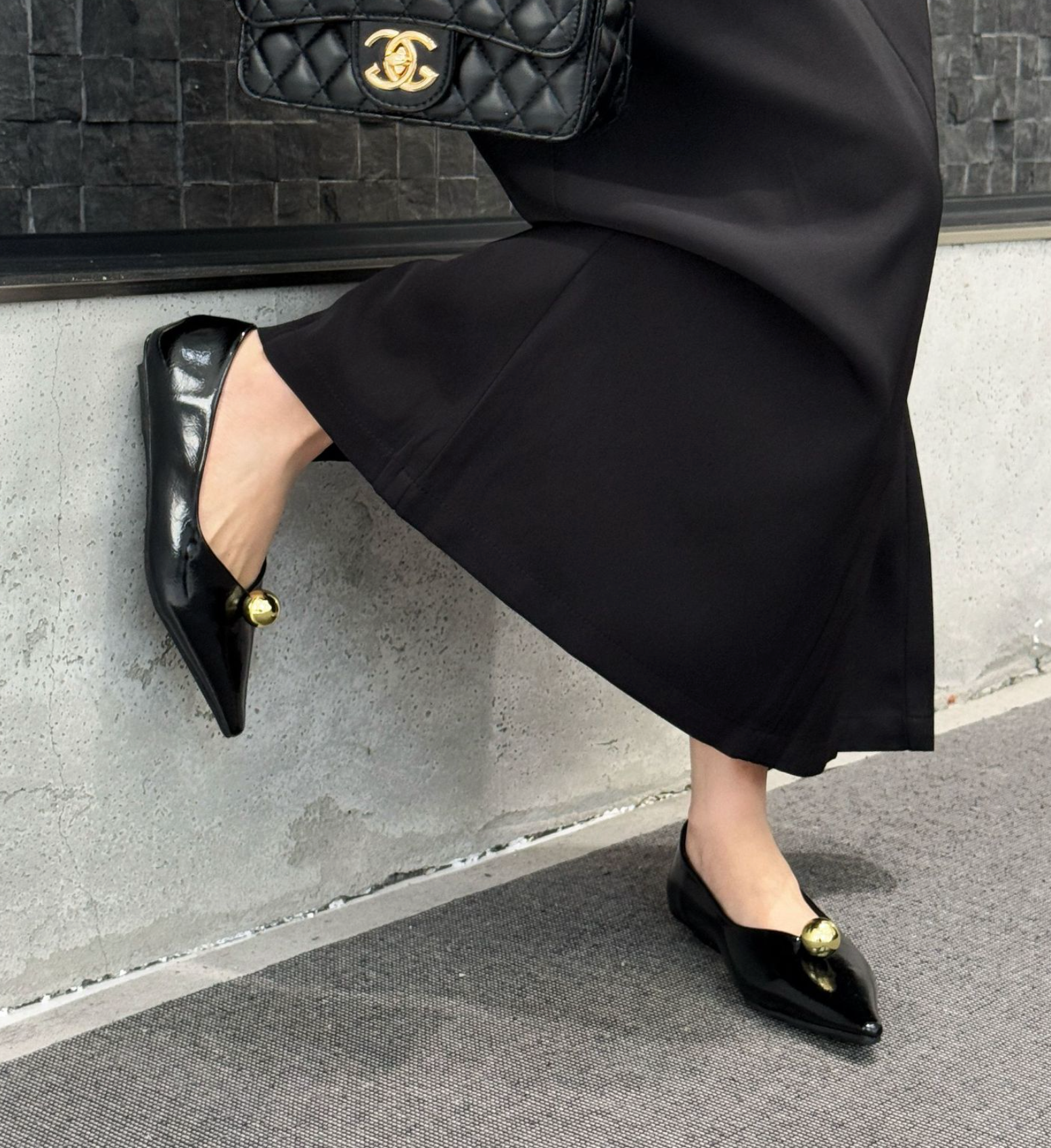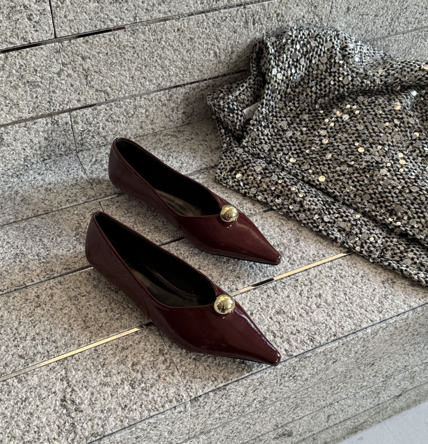 انطلقي نحو أناقة خالدة مع هذا الحذاء الأسود المسطح بمقدمة مدببة. مصنوع من جلد لامع لامع، يتميز هذا الحذاء الأنيق بمقدمة مدببة حادة تُطيل القدم لإطلالة أنيقة. ويبرز قبة ذهبية جريئة تُزين مقدمة الحذاء، مما يُضفي لمسة من الأناقة والرقي العصري. صُمم هذا الحذاء ليجمع بين الراحة والأناقة، ونعله البسيط يُتيح ارتداءً سهلاً من النهار إلى الليل. مثالي للارتداء مع البناطيل الرسمية أو الفساتين أو ملابس السهرة الأنيقة، إنه الخيار الأمثل لإطلالة فاخرة وبسيطة.