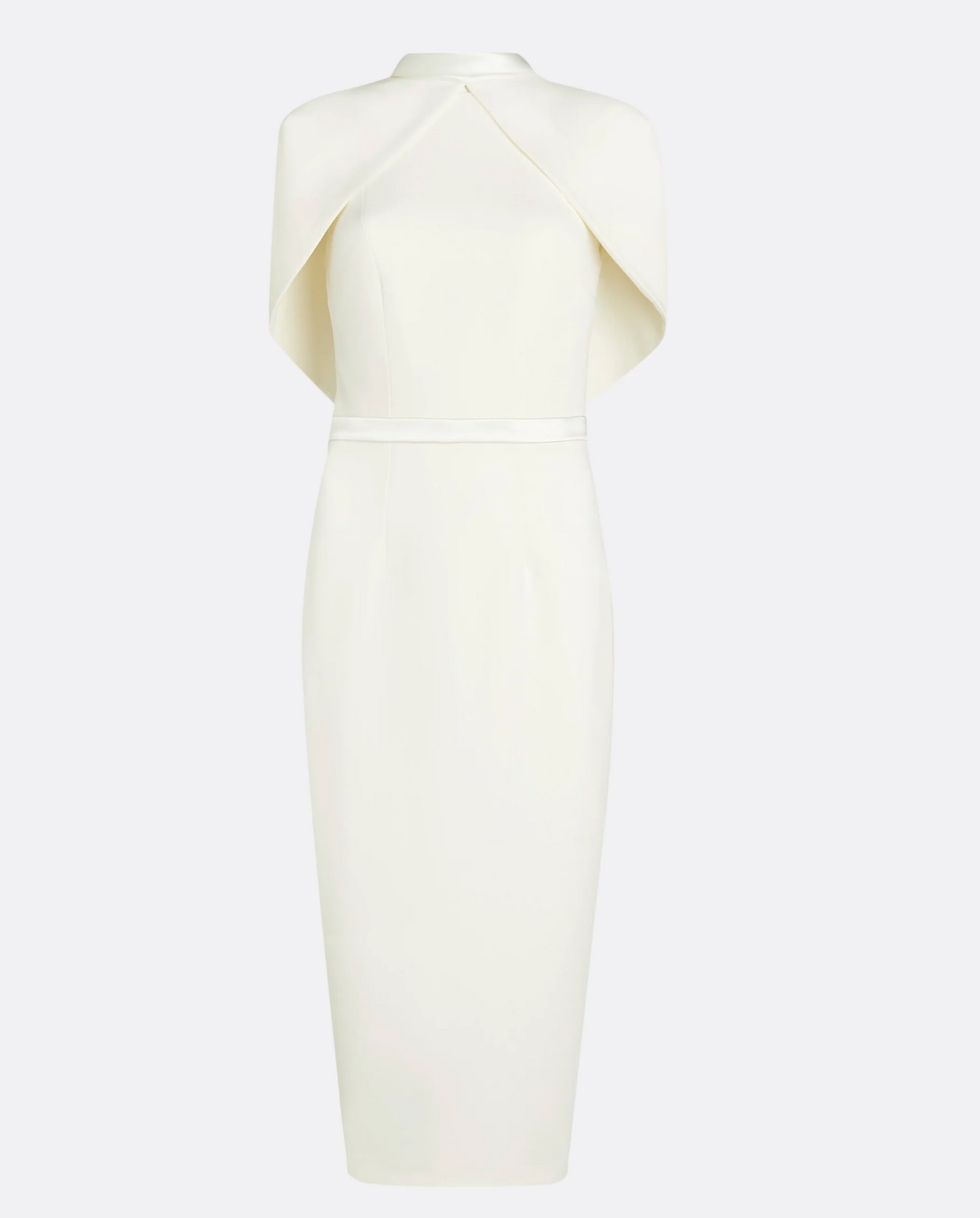 فستان عاجي بسيط بتصميم عمودي، يتميز بياقة عالية أنيقة وغطاء رأس منسق ينساب بأناقة على الكتفين. تصميم أنيق وعصري، مثالي للمناسبات المسائية وإطلالات العرائس العصرية.