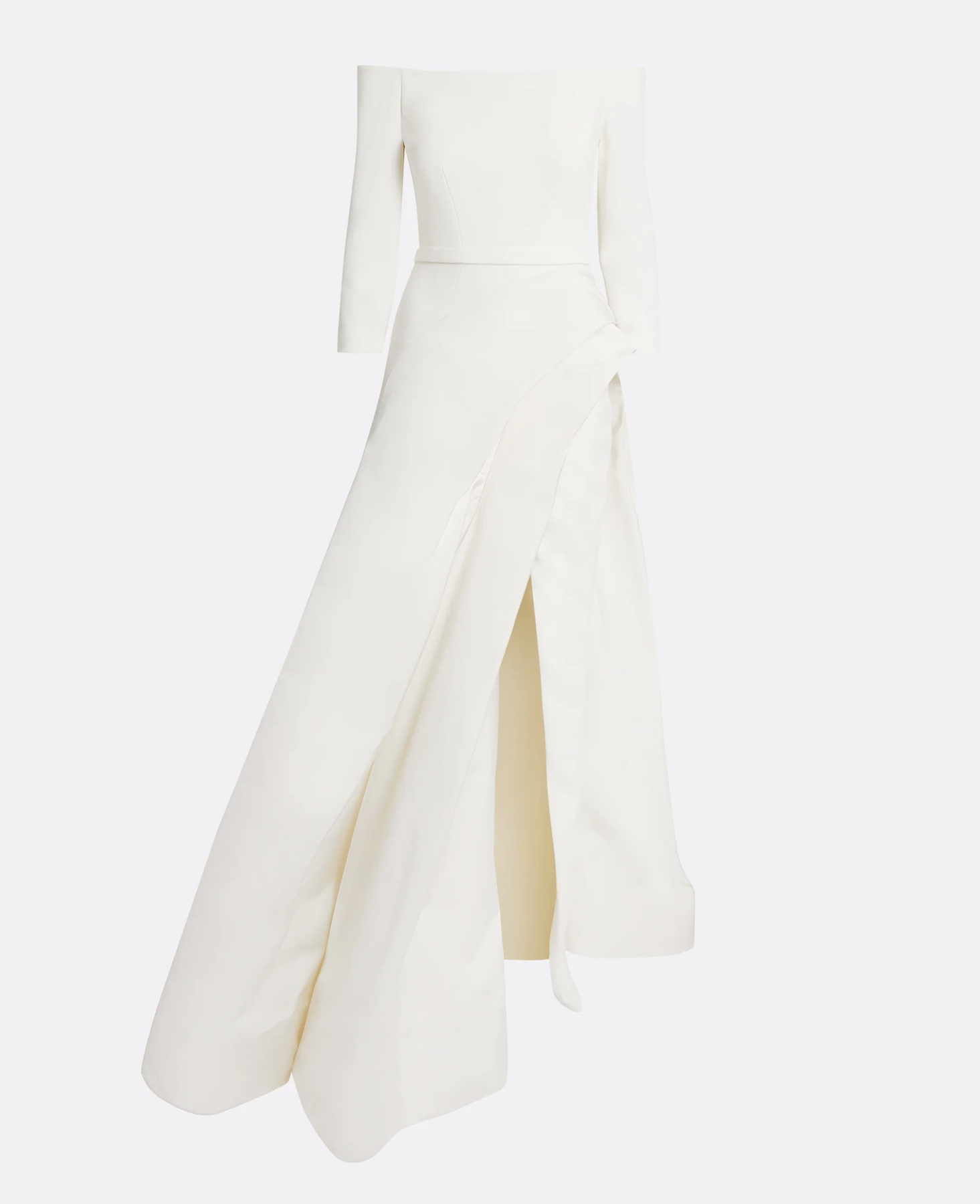 فستان عاجي أنيق بياقة أنيقة مكشوفة الأكتاف، وصدرية ضيقة، وأكمام طويلة. تنورته المنسدلة مزينة بثنيات منحوتة وشق عالٍ، تجمع بين الأناقة الخالدة والجاذبية العصرية - مثالي للسهرات أو حفلات الزفاف.