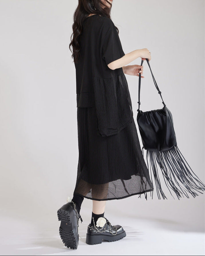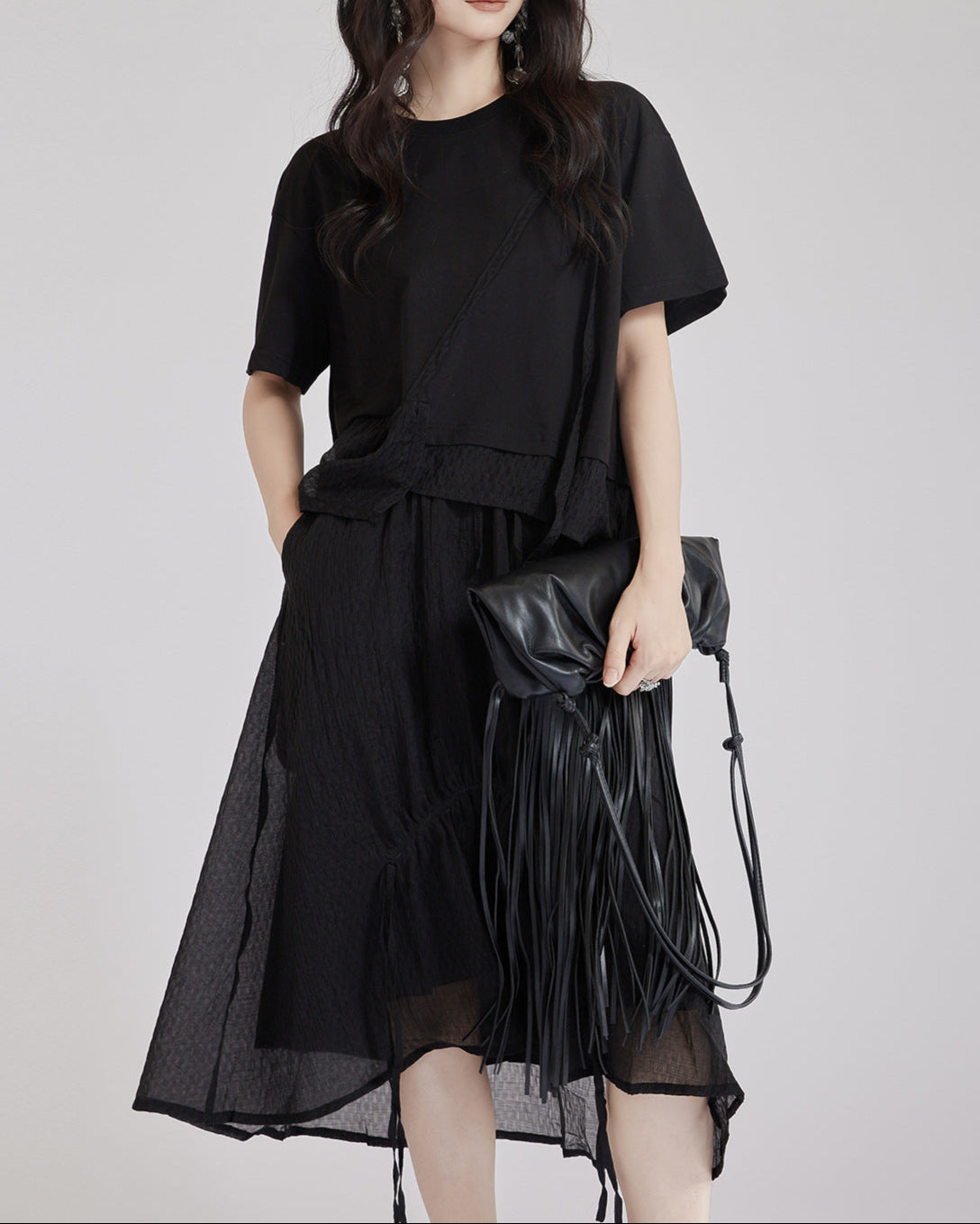 An asymmetrical pure cotton T-shirt designed with a layered mesh panel. The unique hemline and textured contrast add a stylish touch to your relaxed style, making it perfect for casual wear. Available in classic black and crisp white.