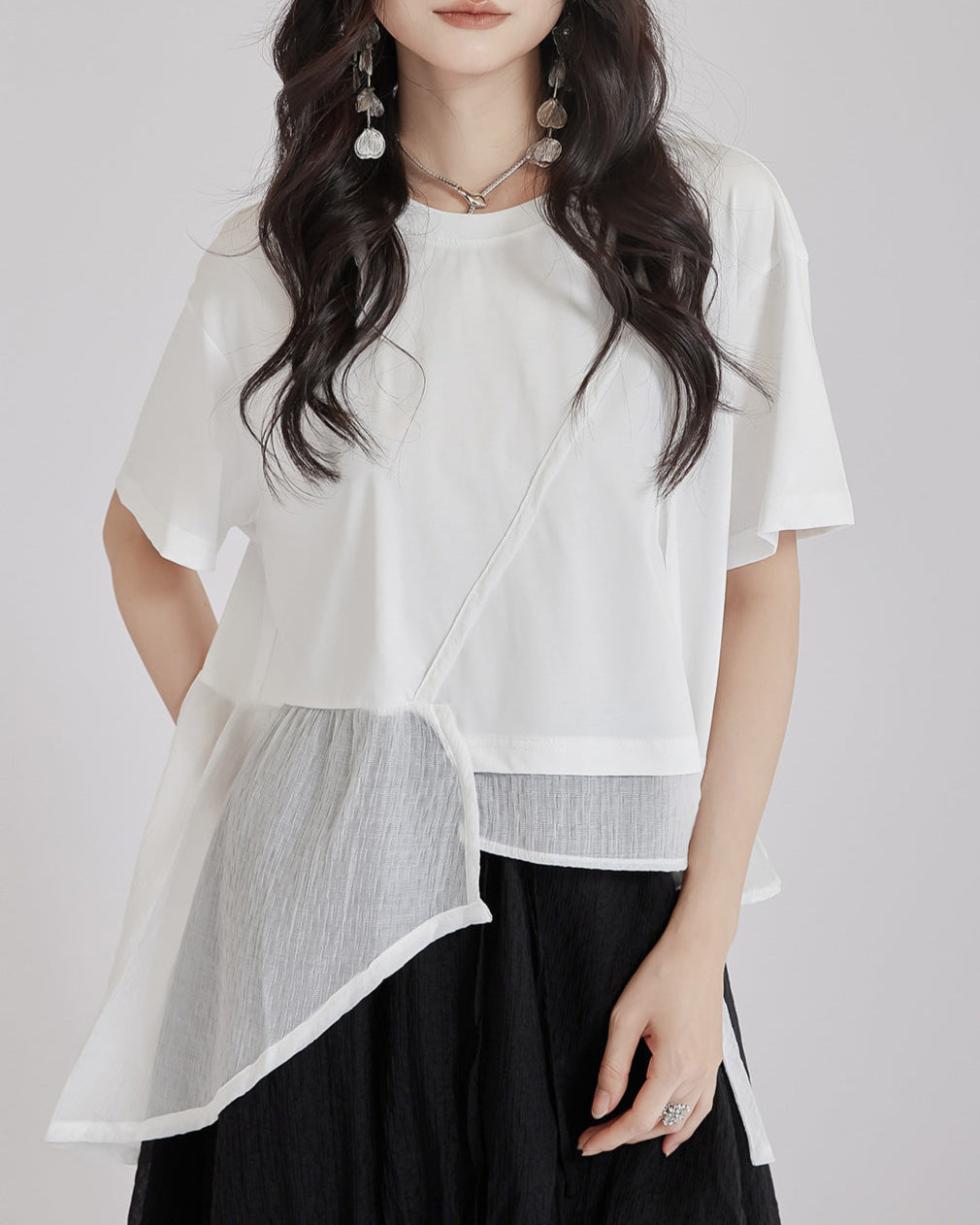 asymmetric cotton T-shirt with layered mesh panel – HARUX