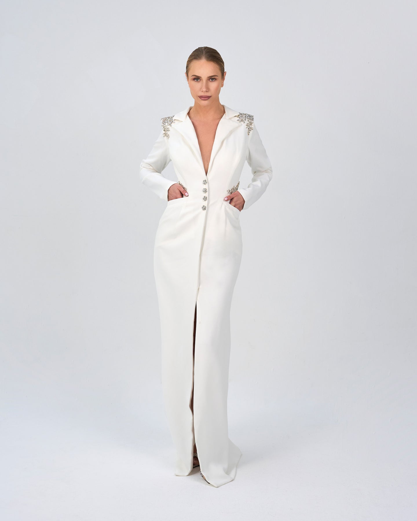 Sleek white gown designed as a tailored blazer dress, adorned with crystal embellishments on the shoulders and waist, featuring a deep neckline and elegant front slit for a sophisticated, modern look.