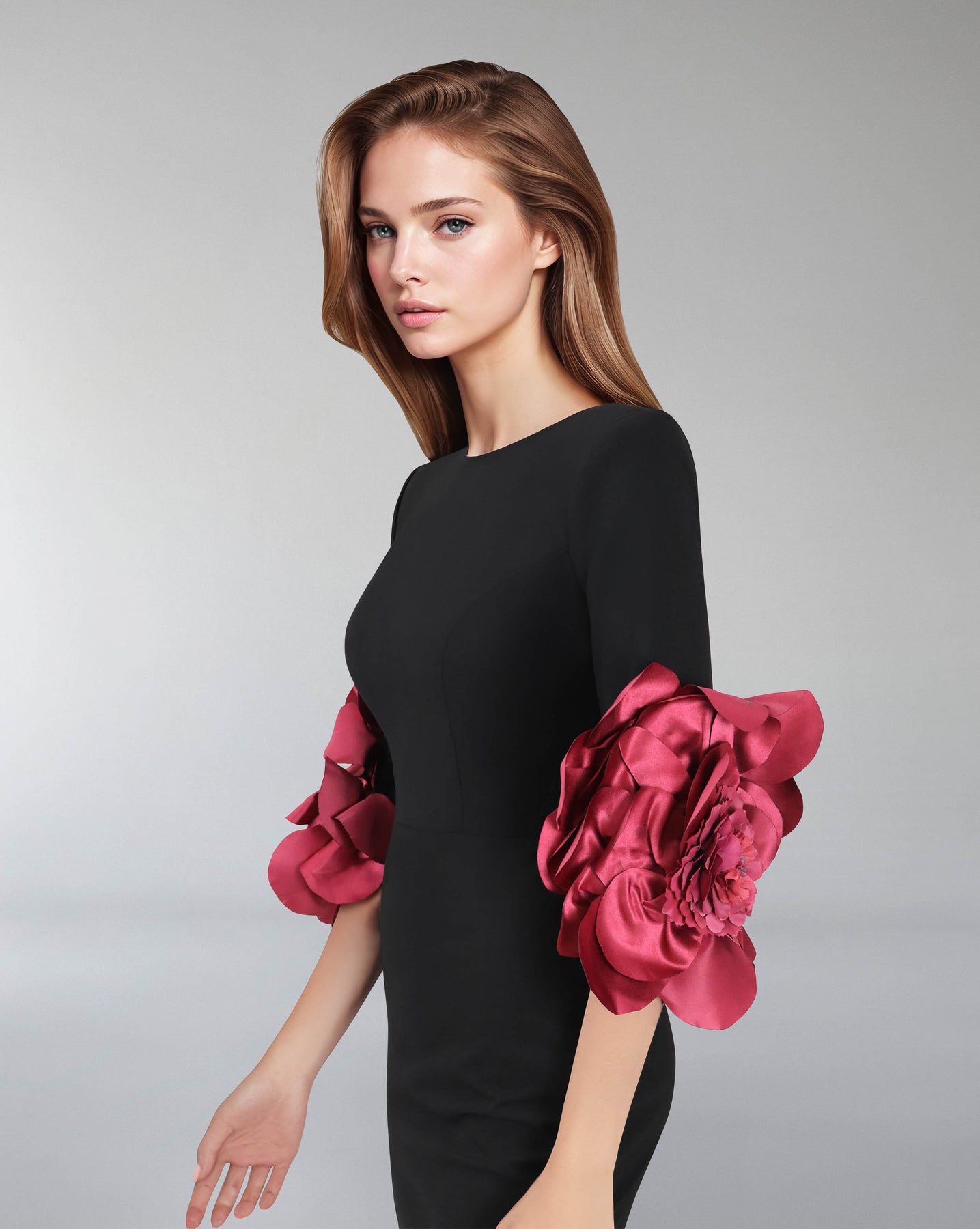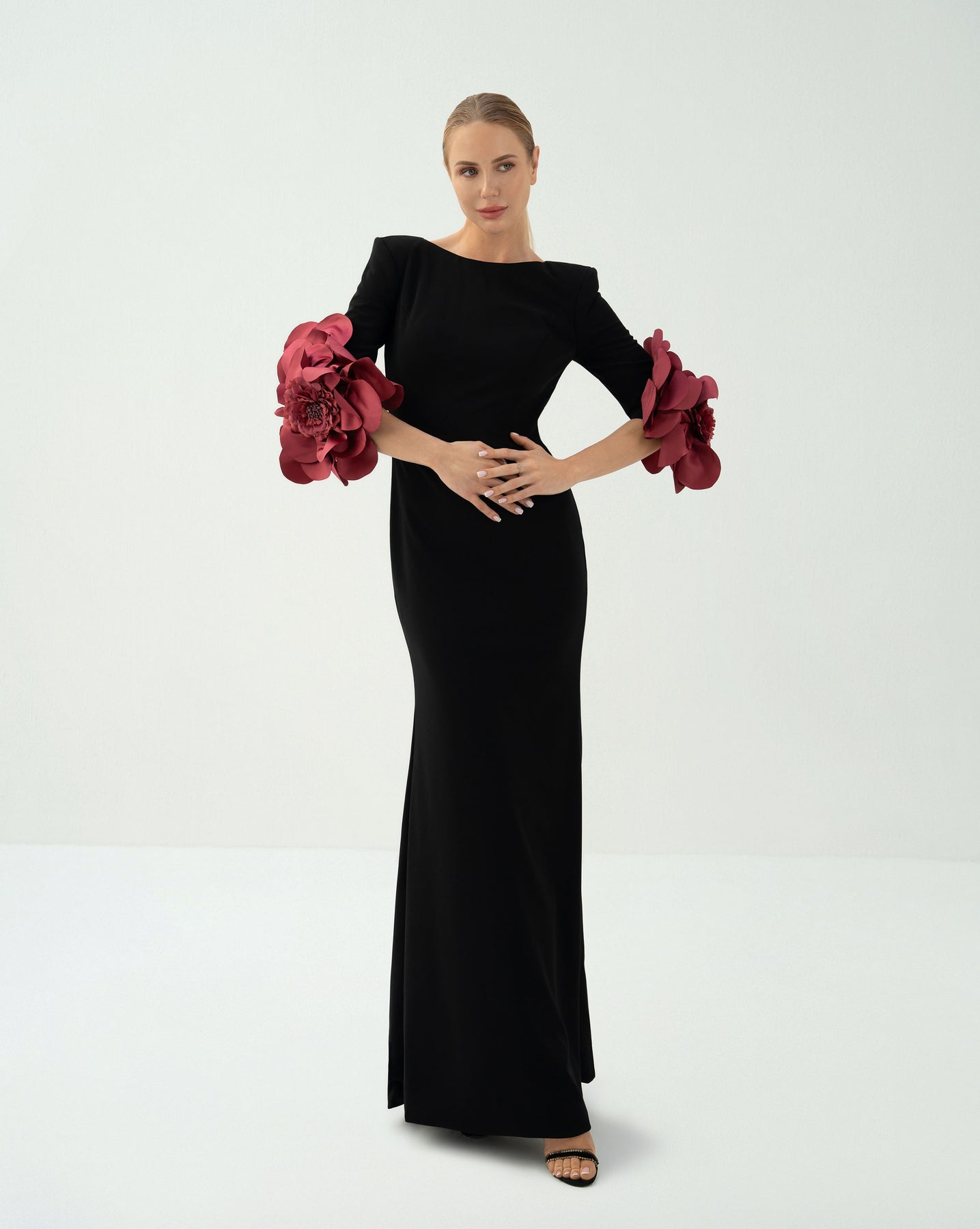 Sleek floor-length black gown with a fitted silhouette, accented by dramatic deep red oversized floral appliqués on the sleeves for a bold, couture-inspired finish.