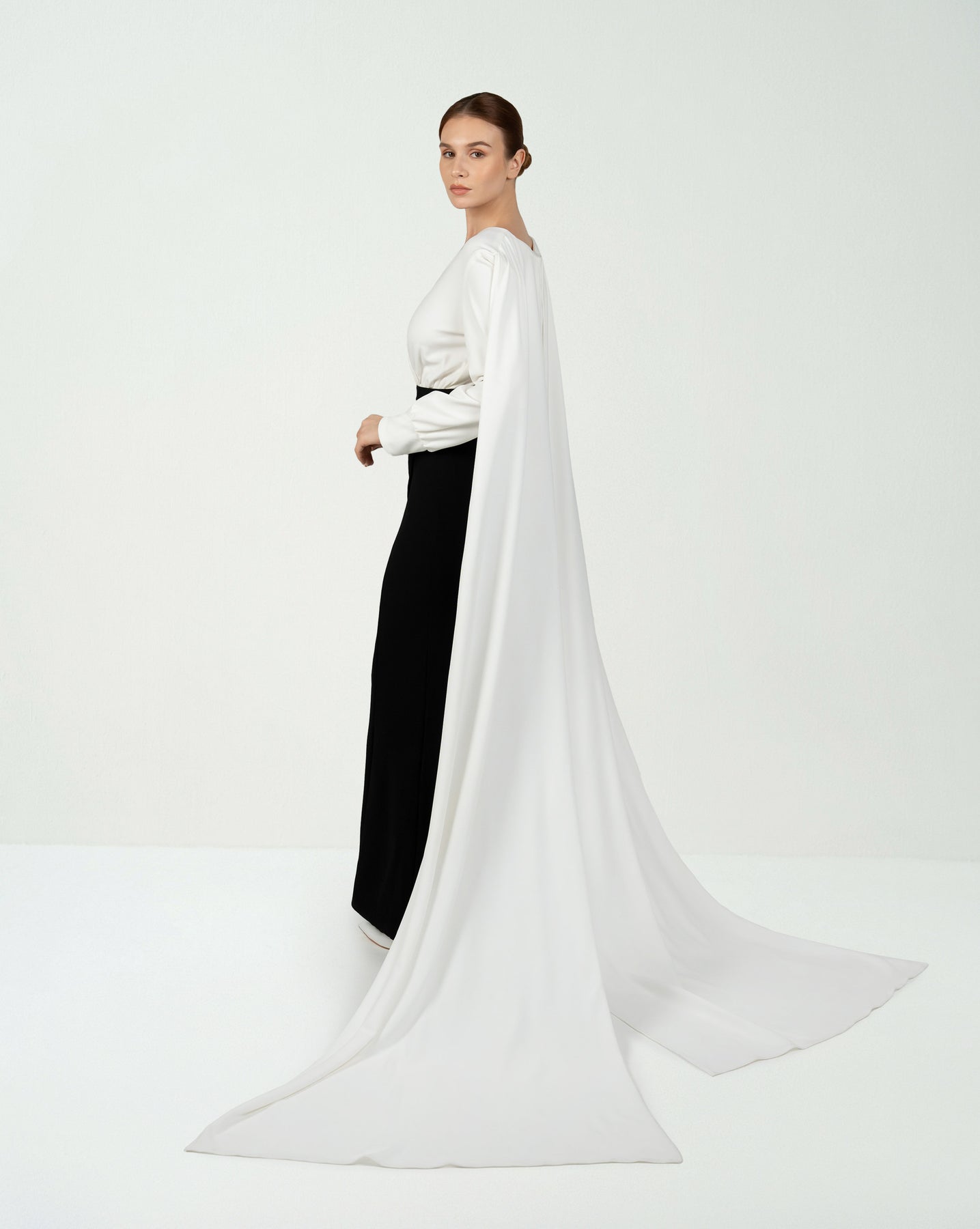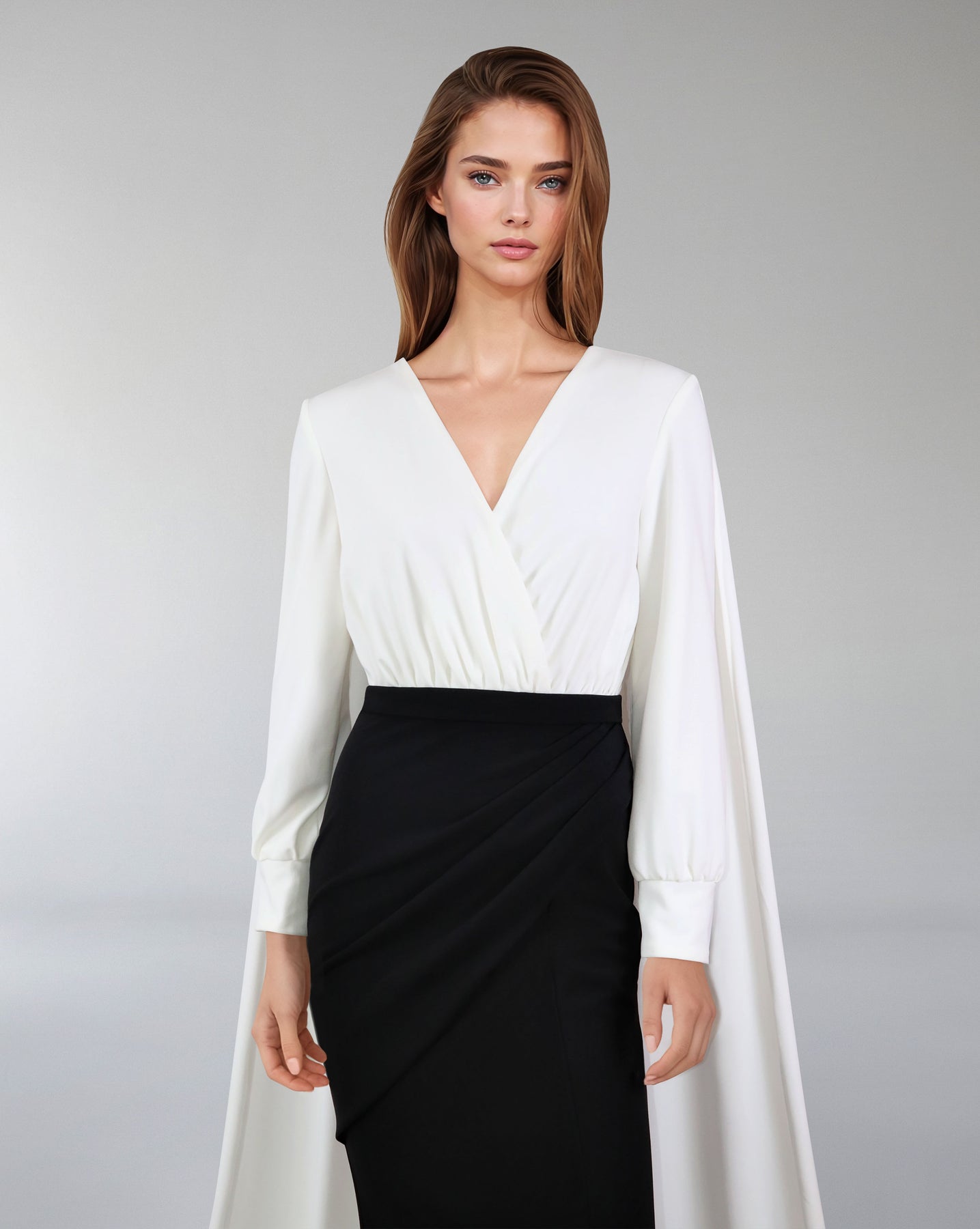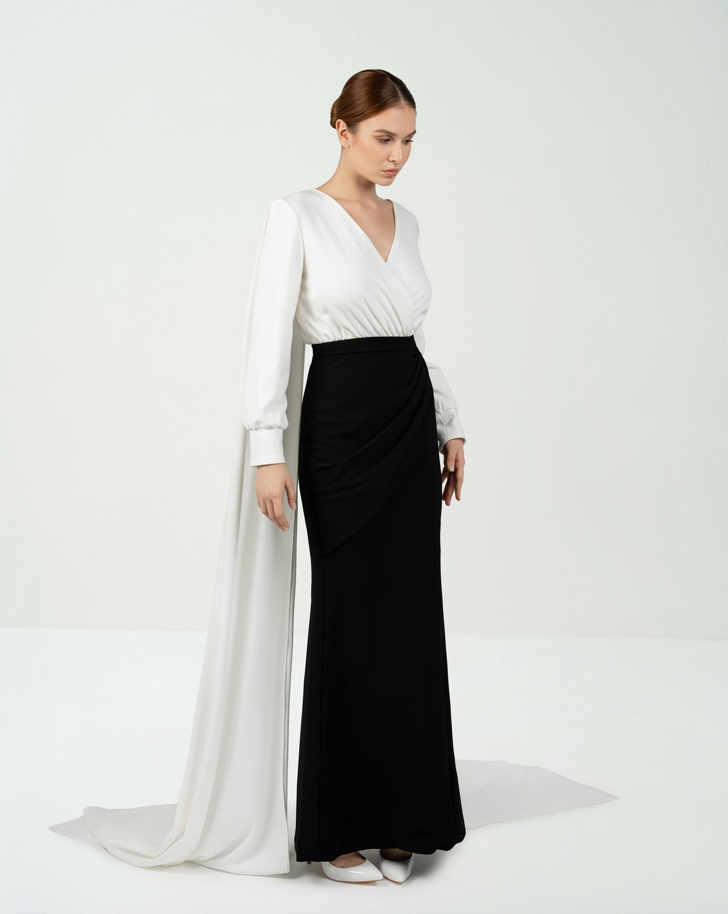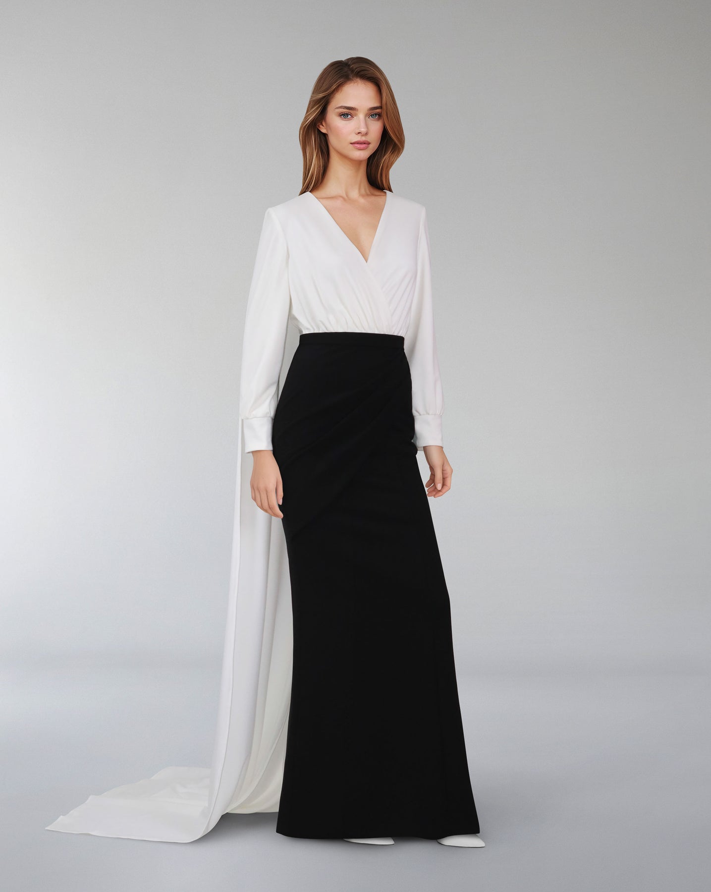 Graceful black-and-white evening gown featuring a wrap-style bodice, fitted floor-length skirt, and an attached flowing cape for a dramatic yet refined silhouette.