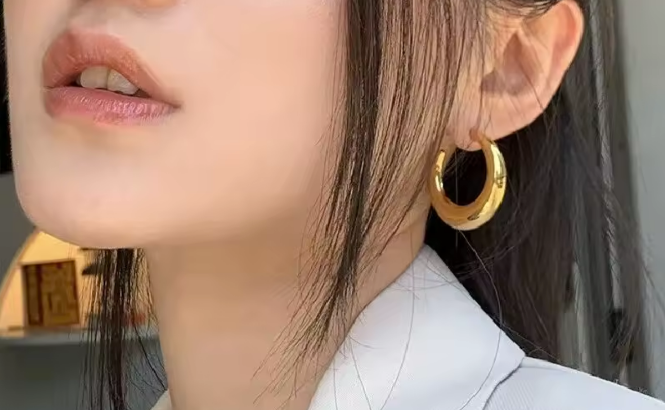 Bold crescent hoop earrings crafted from lustrous gold-tone metal. Their chunky, sculptural design and soft curves add a luxurious touch to any look, perfect for adding a touch of elegance and sophistication to your daytime and evening looks.