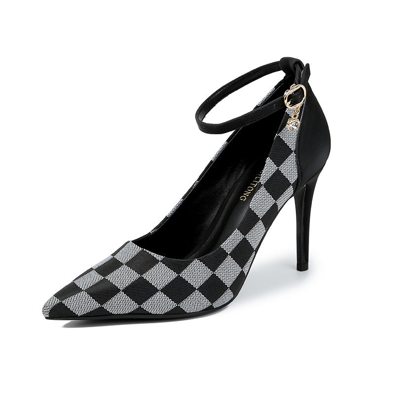 Chic pointed-toe heels featuring a bold checkered pattern, slim stiletto heel, and adjustable ankle strap with charm detail. A perfect blend of elegance and modern edge.