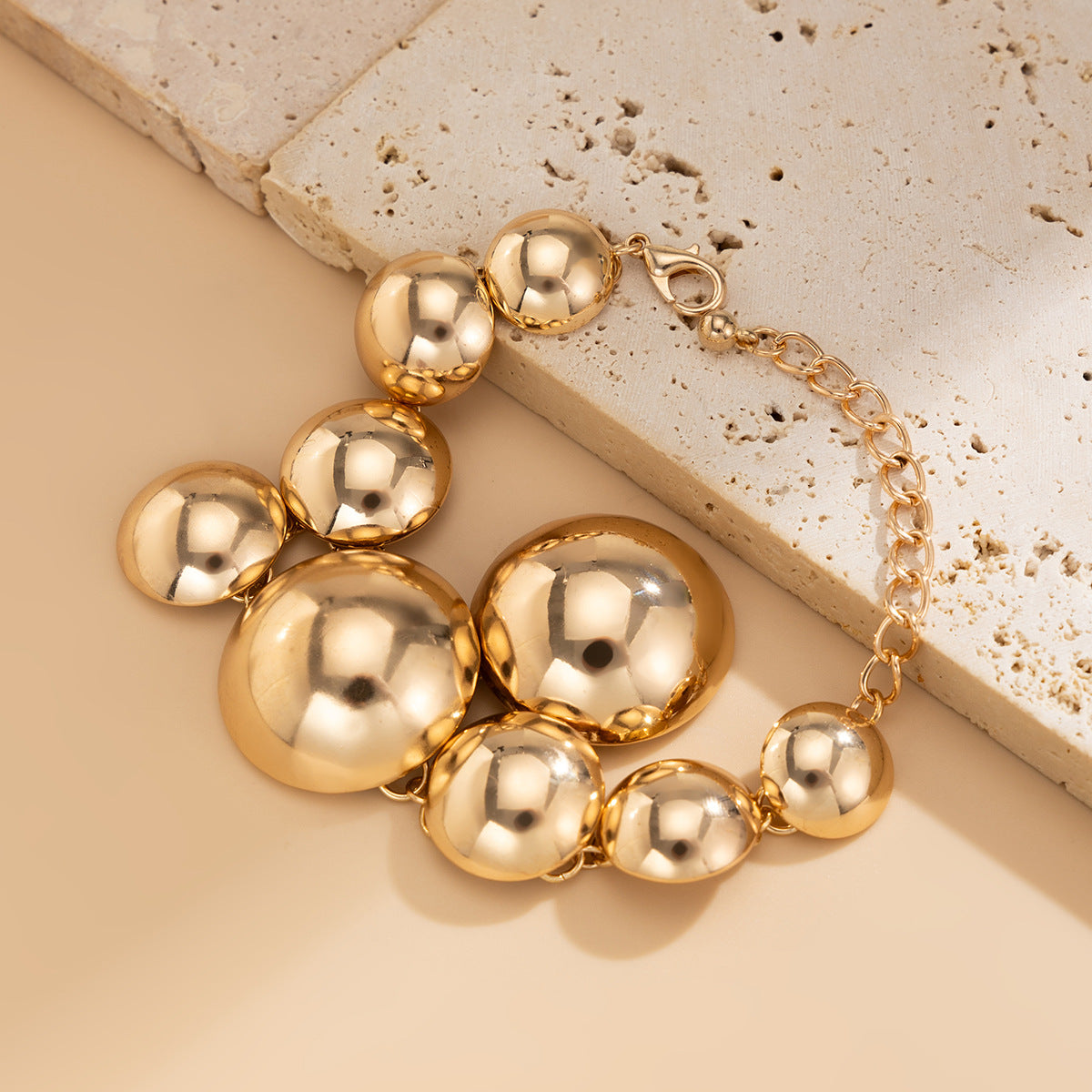 Make a bold statement with this chunky bubble bracelet, featuring oversized metallic spheres with a mirror-like glossy finish. Designed to catch the light from every angle, this sculptural piece blends modern glam with playful elegance. Finished with an adjustable chain for a comfortable fit, it’s the perfect accessory to elevate your everyday look or complete a night-out ensemble.