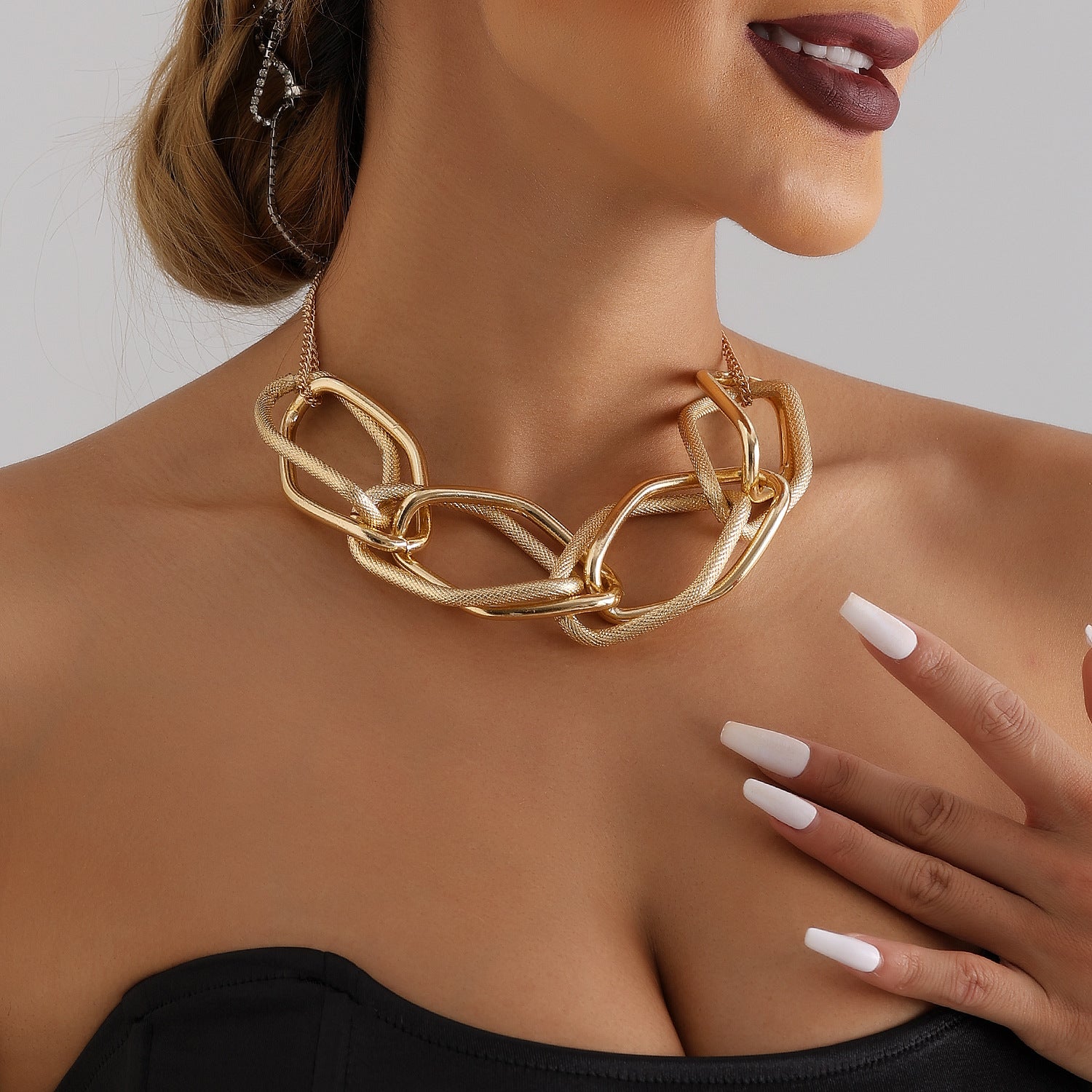 A bold and sculptural necklace featuring oversized interlocking oval links with a mix of polished and textured gold accents. The double chain clasp adds a sophisticated contrast, making it the perfect accessory to elevate simple outfits and evening looks. It's a statement piece that confidently showcases your elegance.