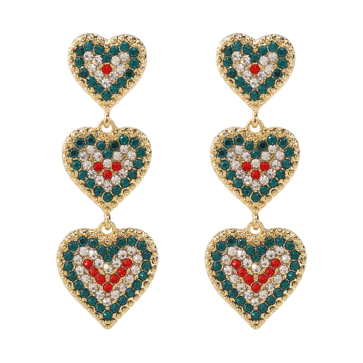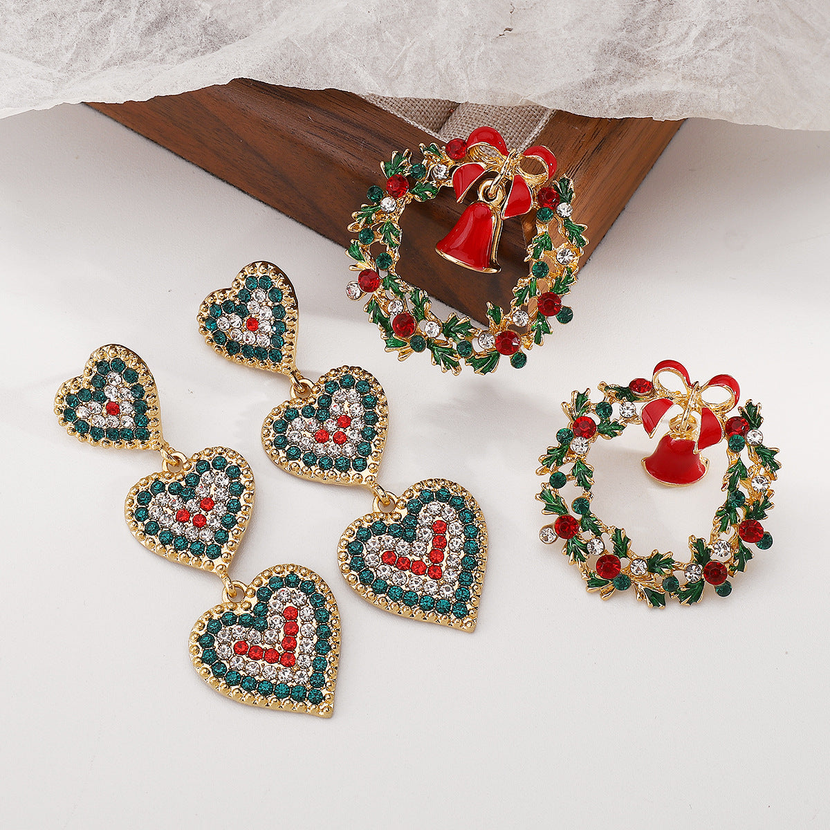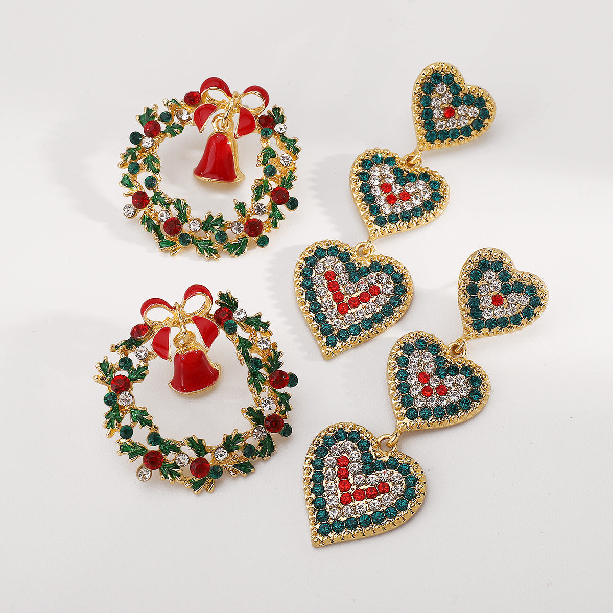 Vibrant statement earrings featuring crystal-studded hearts and holiday wreath designs with red bell accents—perfect for adding sparkle and festive charm to any outfit. Material: Alloy + rhinestone