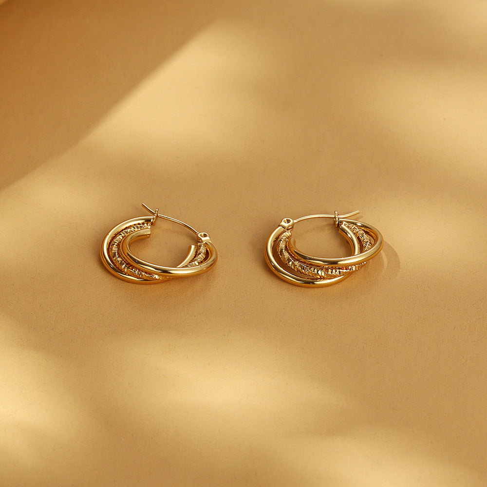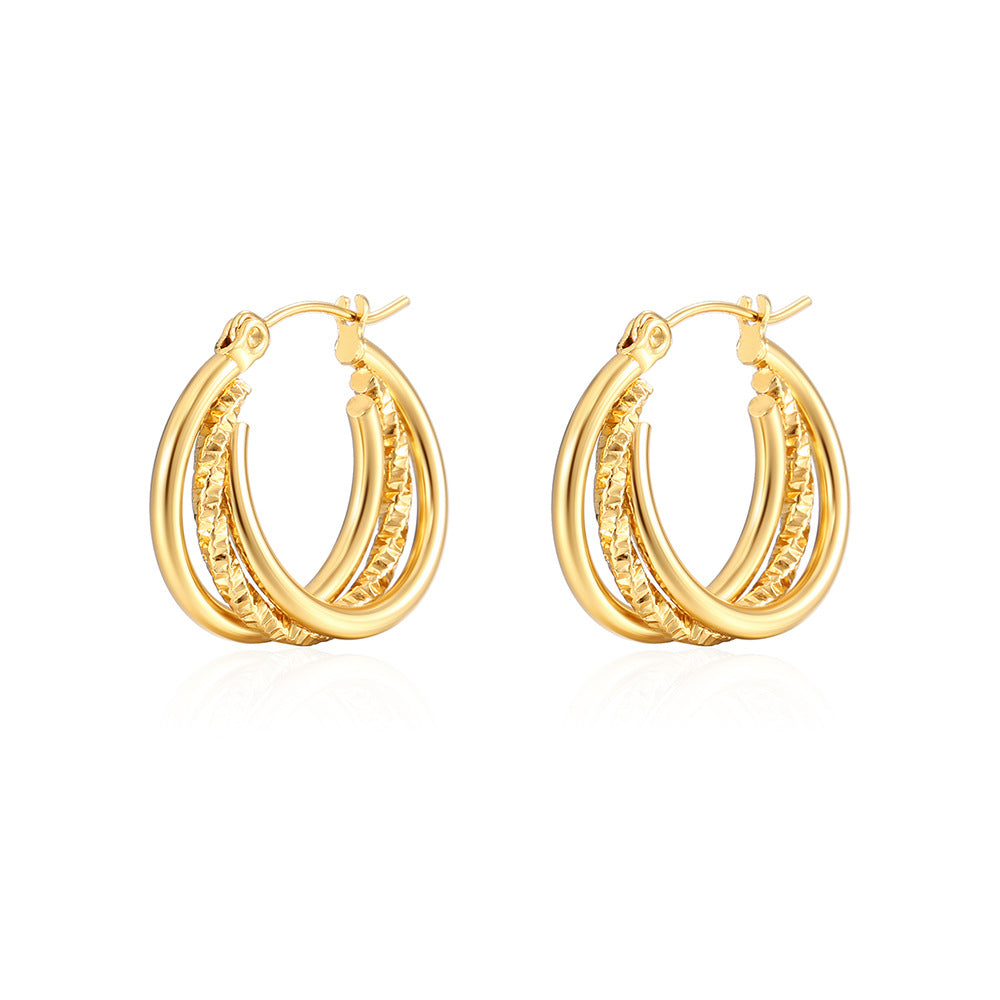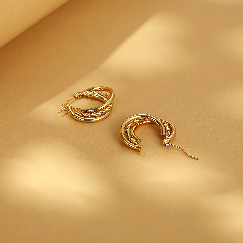 These elegant gold-toned earrings feature a double-hoop design with intricate etched detailing on the inner curve, adding depth and texture to a classic silhouette. Perfect for elevating both everyday and evening looks with a touch of vintage charm.