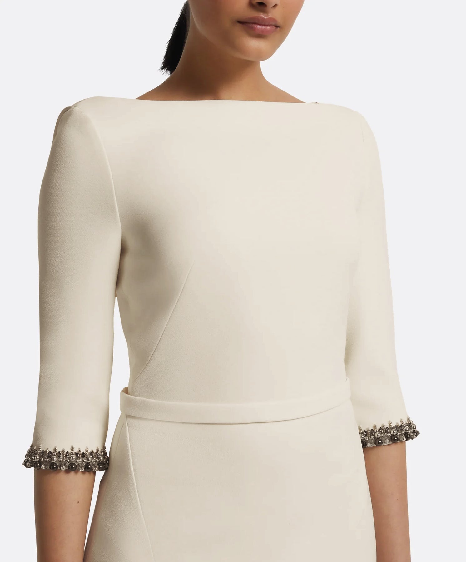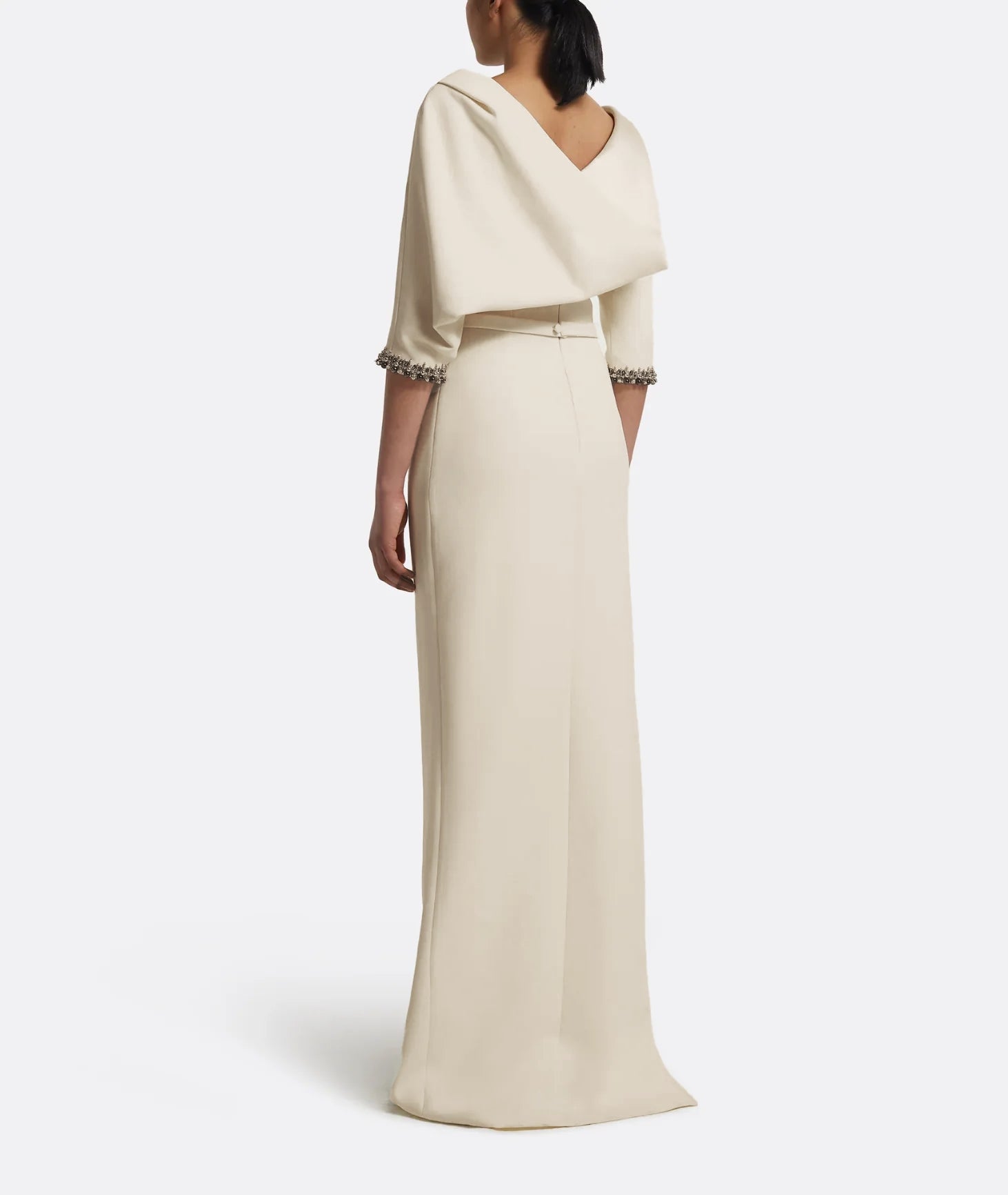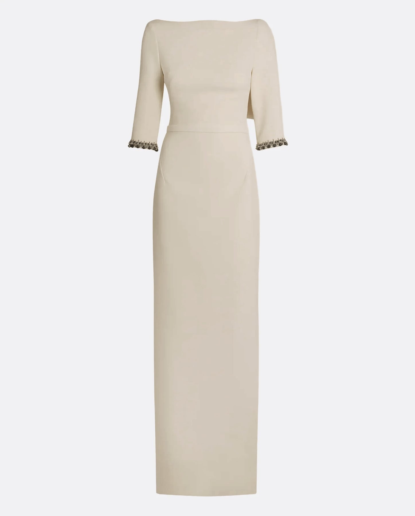 An elegant ivory column gown with a bateau neckline and sleek three-quarter sleeves finished with crystal-embellished cuffs. A timeless silhouette infused with modern sparkle, perfect for refined evening occasions.