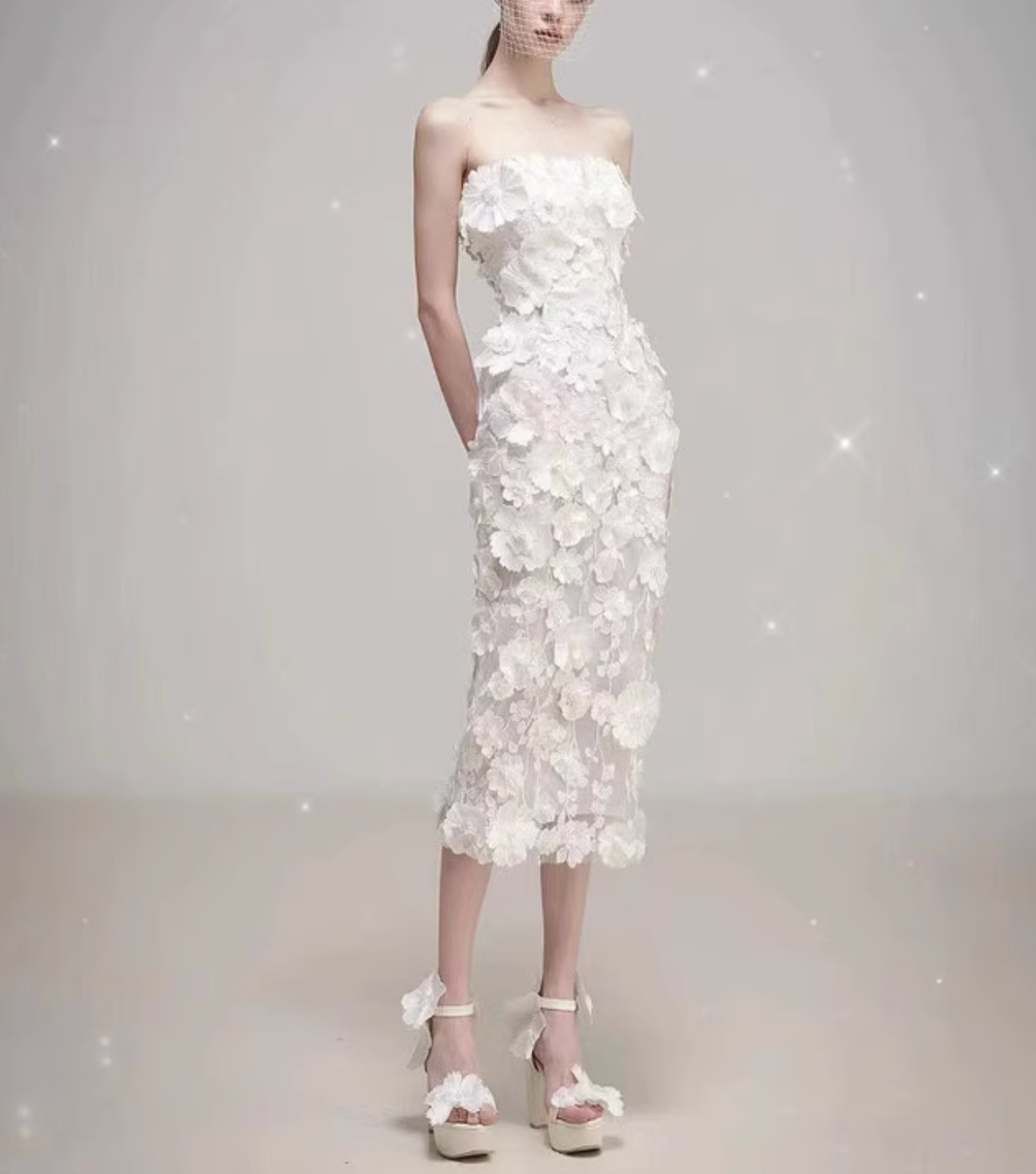 Ethereal white gown adorned with 3D floral appliqués, delicate spaghetti straps, and a flowing sheer train that adds a dreamy, romantic finish.