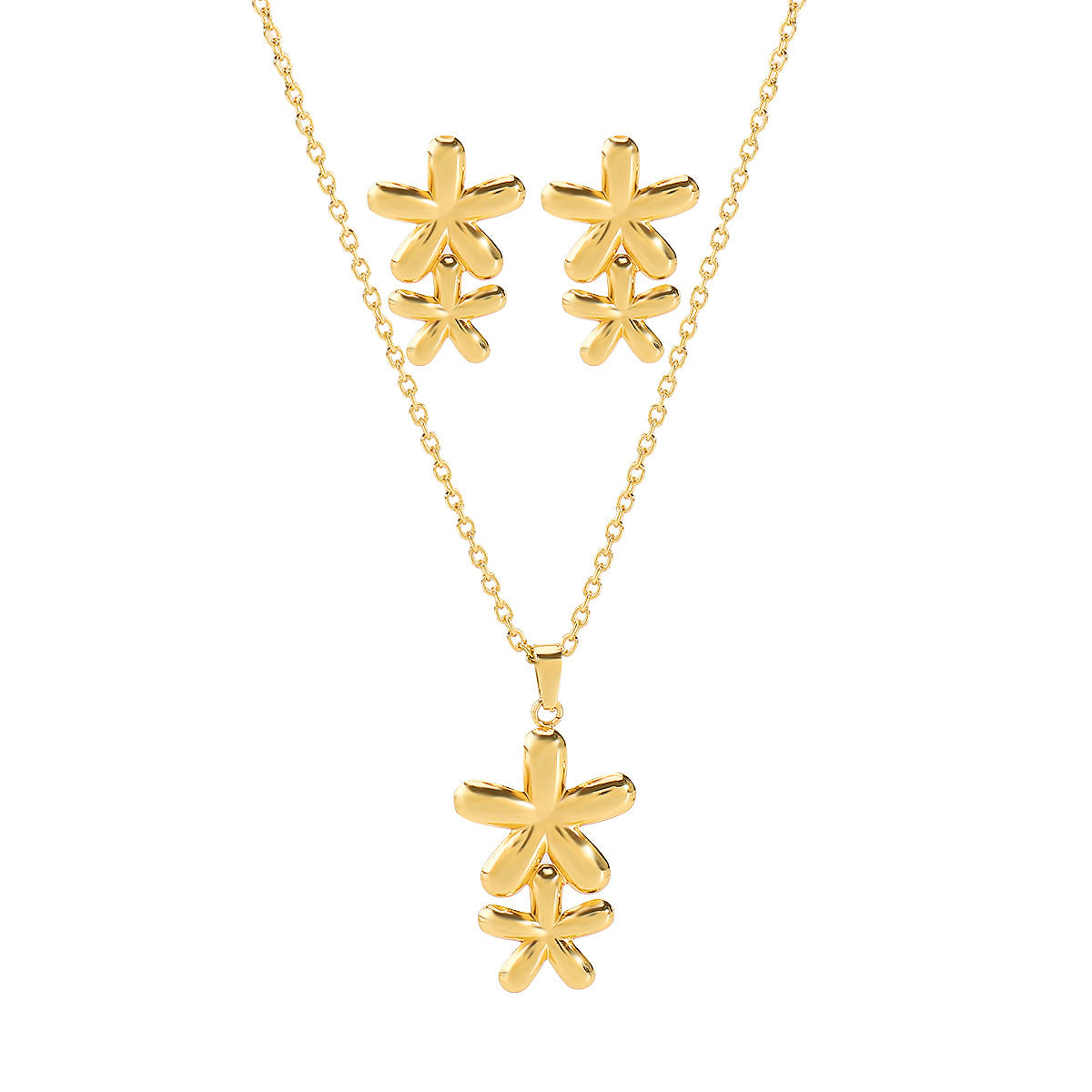 A carefully curated collection of five gold-plated jewelry sets, each featuring a unique pendant and matching earrings. From star designs to hammered motifs and pearl-encrusted medallions, these versatile sets are perfect for adding an elegant touch.