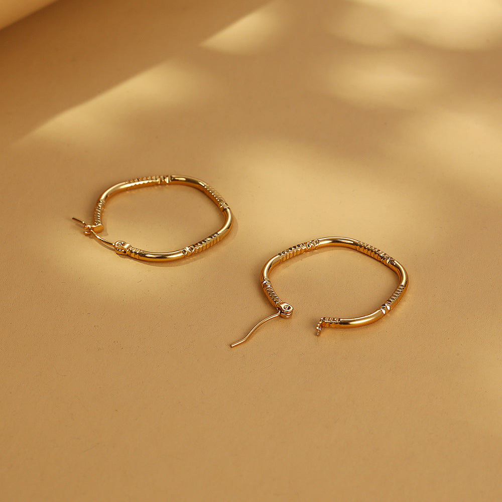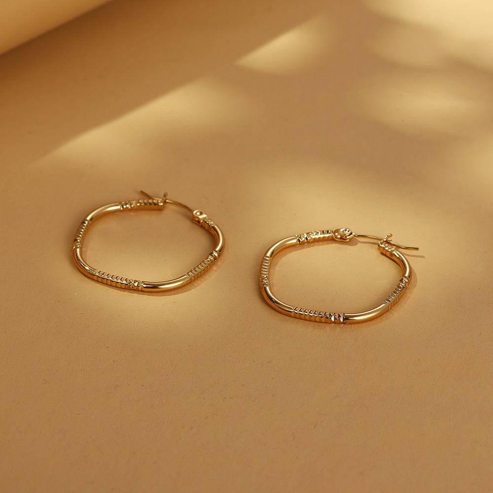 These gold-tone square hoop earrings feature a unique rounded-edge silhouette, accented with subtle engraved detailing for an artisanal touch. Lightweight and elegant, they add a sophisticated edge to both casual and formal outfits. A versatile addition to any jewelry collection, perfect for elevating your everyday style.