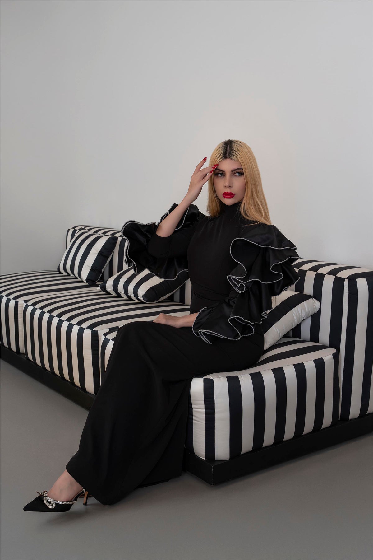 High-Neck Column Dress with Ruffled Statement Sleeves - ONYX