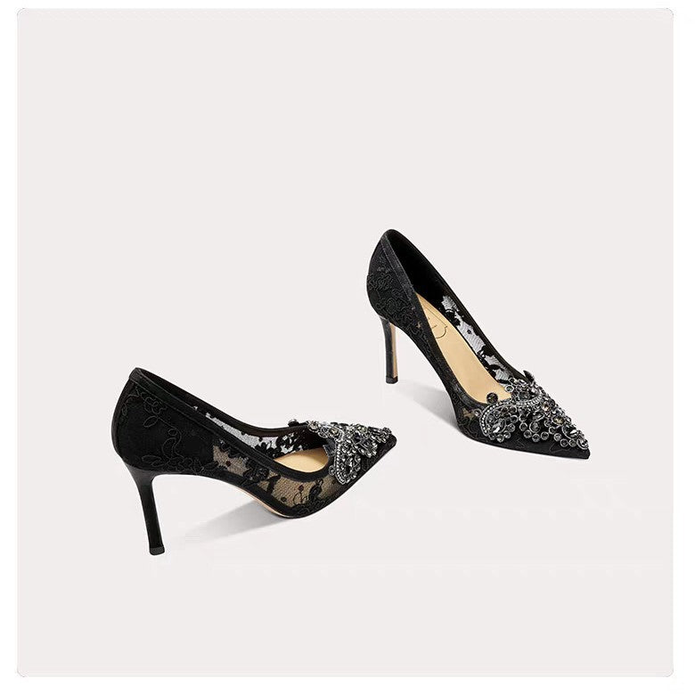 Elegant lace-up stiletto pumps featuring a pointed toe embellished with intricate crystal embellishments - perfect for special occasions and glamorous looks. Upper material: lace Sole material: rubber Insole material: sheepskin Lining material: Microfiber Size: Size China Size (mm) Sports Shoe Size Foot Length (mm) Foot Girth (mm) 34 220 34.5–35 216–220 201–205 35 225 35.5–36 221–225 206–210 36 230 36.5–37 226–230 211–215 37 235 37.5–38 231–235 216–220 38 240 38.5–39 236–240 221–225 39 245 39.5–40 241–245 226–230 40 250 40.5–41 246–250 231–235