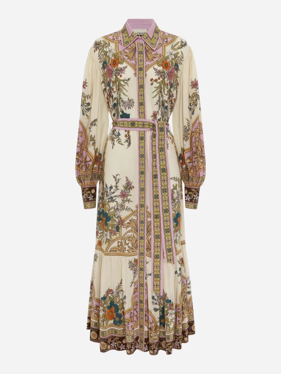 Elegant midi dress adorned with intricate floral and baroque-inspired patterns, featuring a belted waist, button-down front, and long puffed sleeves. A timeless piece blending vintage charm with modern sophistication. Fabric name: Cotton and linen Size Bust (cm) Length (cm) Sleeve Length (cm) S 102 132 54 M 106 133 55 L 110 134 56 XL 114 135 57 XXL 118 136 58