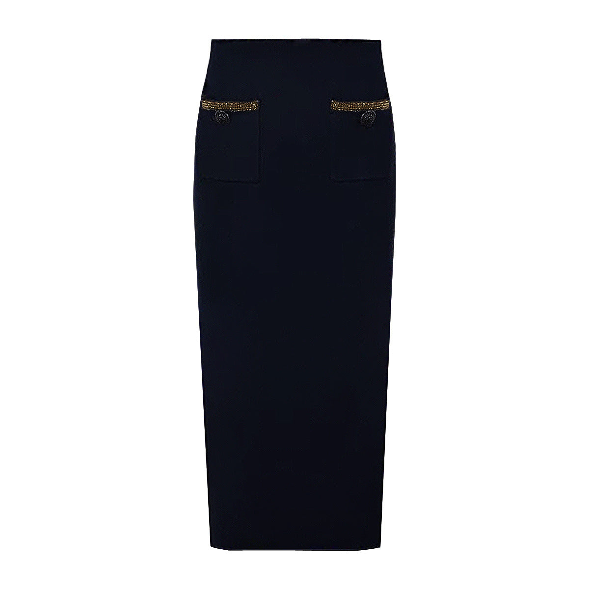 A stylish tweed suit featuring a long-sleeved jacket and a matching pencil skirt, accented with metallic trim and decorative buttoned pockets. Perfect for a sophisticated look.