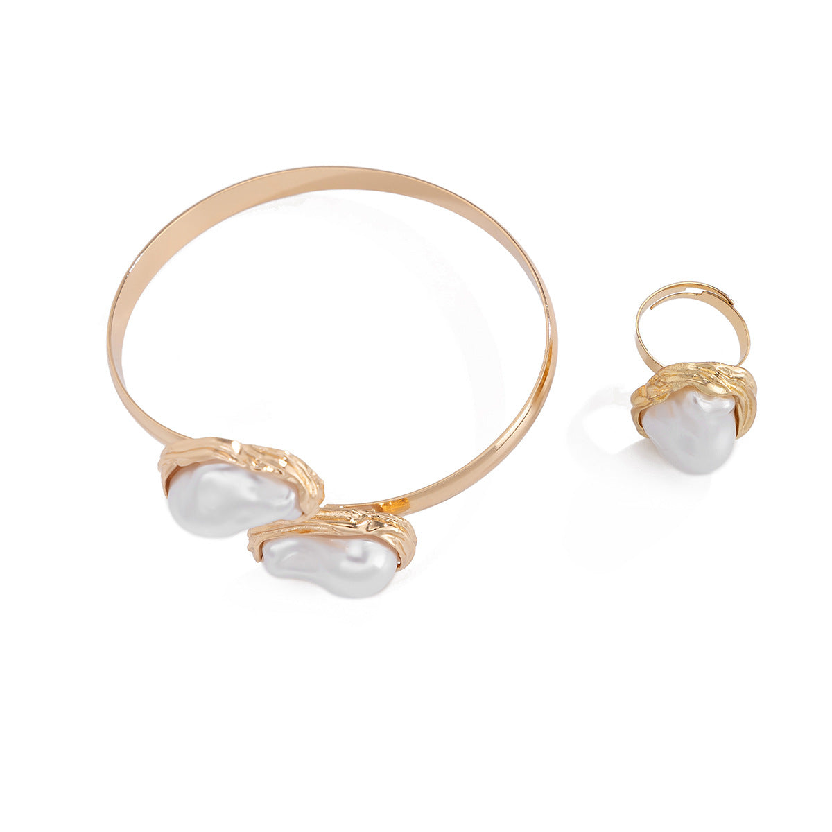 An elegant two-piece set featuring a wide open bracelet and matching ring, each embellished with faceted faux pearls framed in gold or silver with an organic feel. Combining modern simplicity with timeless charm, this set is perfect for any occasion with a touch of contemporary luxury.