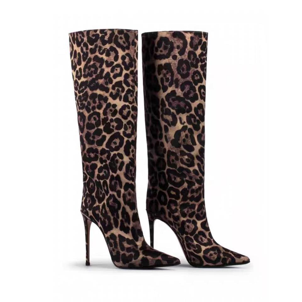 Fierce and elegant, these leopard print knee-high boots feature a pointed toe and slender stiletto heel for a bold, statement-making silhouette that exudes confidence and allure.