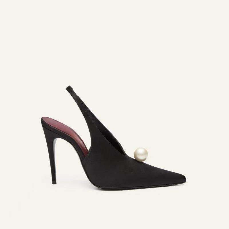 Elegant slingback stiletto heels featuring a sleek pointed toe and a single statement pearl detail. A refined fusion of sophistication and modern minimalism.