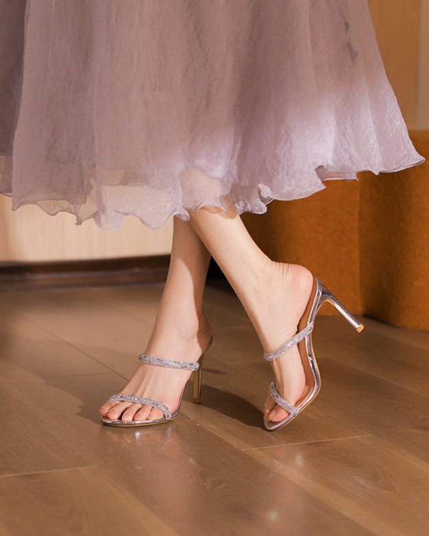 Attractive metallic heel featuring double rhinestone straps and a sleek, high-low design - perfect for special occasions