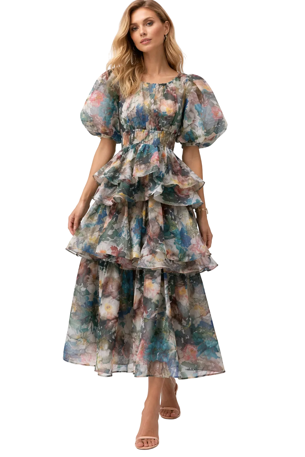 A romantic midi dress featuring soft puff sleeves, a gathered elastic waist, and cascading tiered ruffles for graceful movement. Crafted in a delicate patterned fabric, this feminine silhouette blends vintage charm with modern elegance—perfect for daytime occasions and chic gatherings.