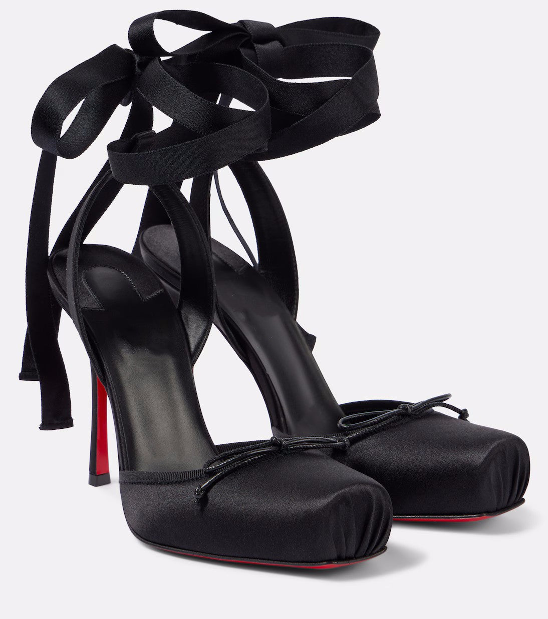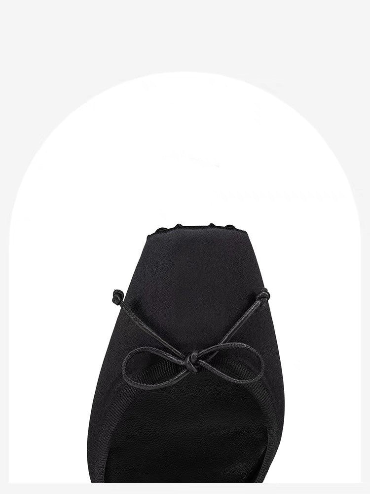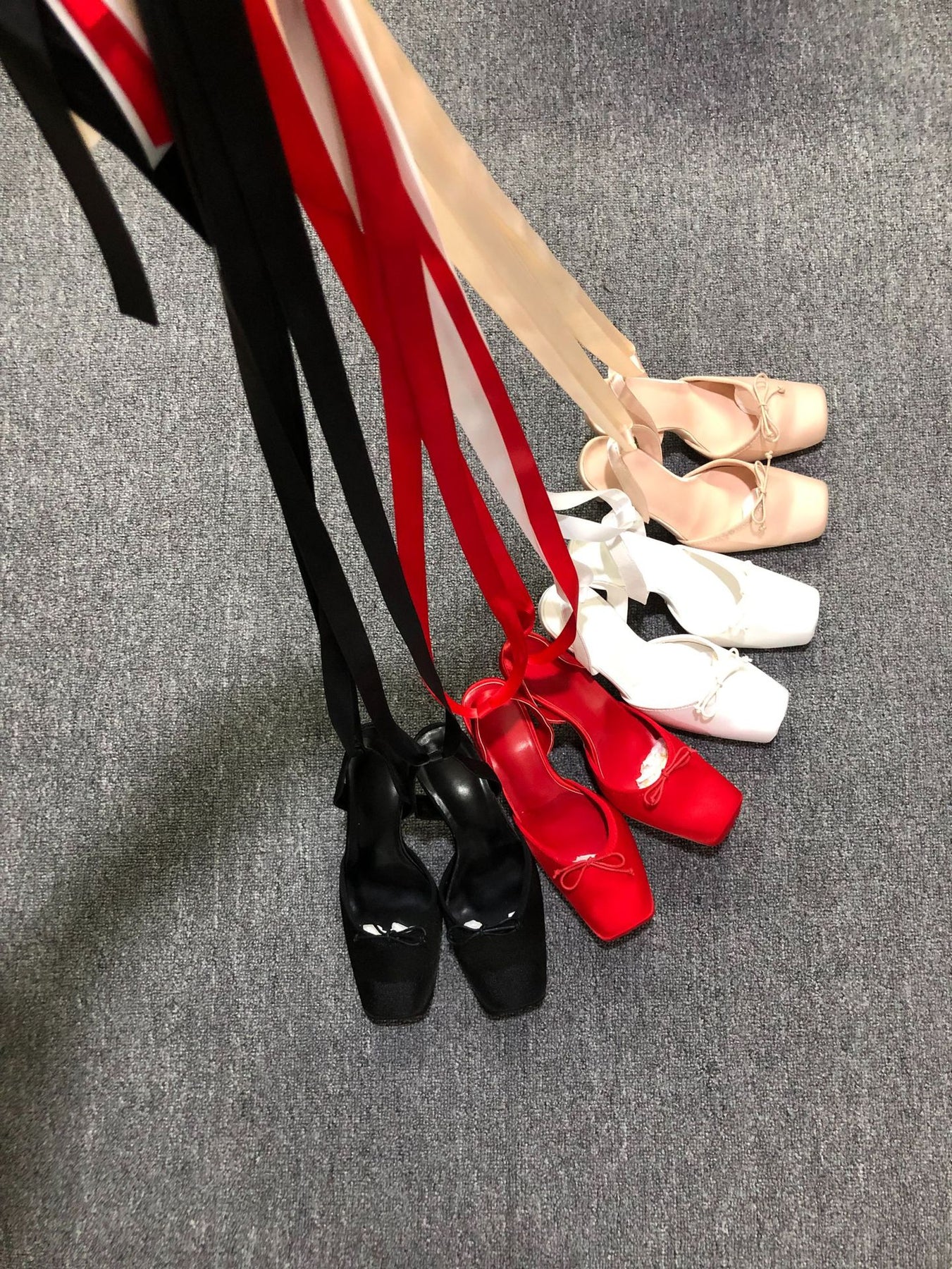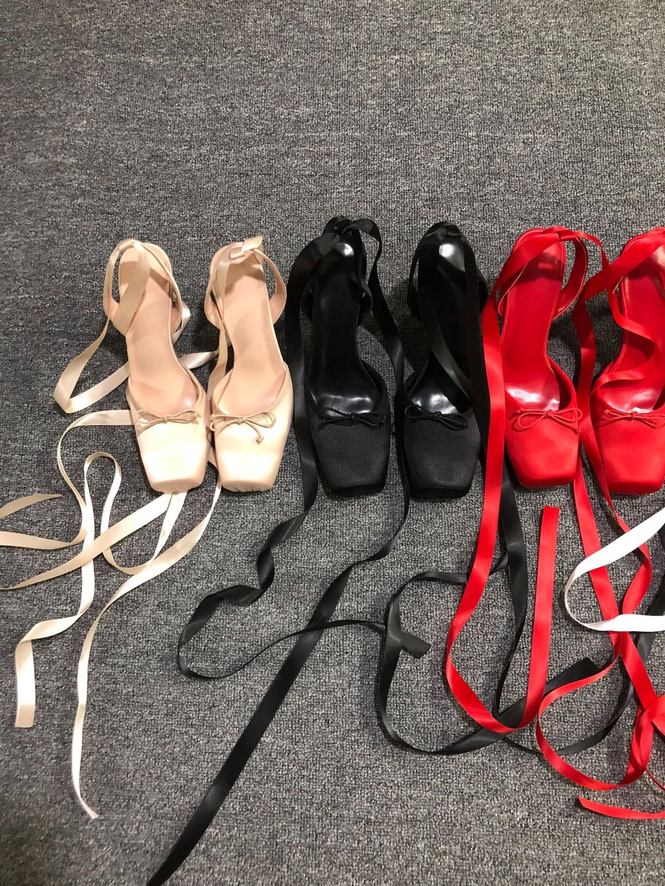 Elegant black satin heels featuring a soft square toe, delicate front bow, and long ankle ribbons for a romantic wraparound finish. Elevated on a slim high stiletto, they exude timeless ballerina-inspired charm.