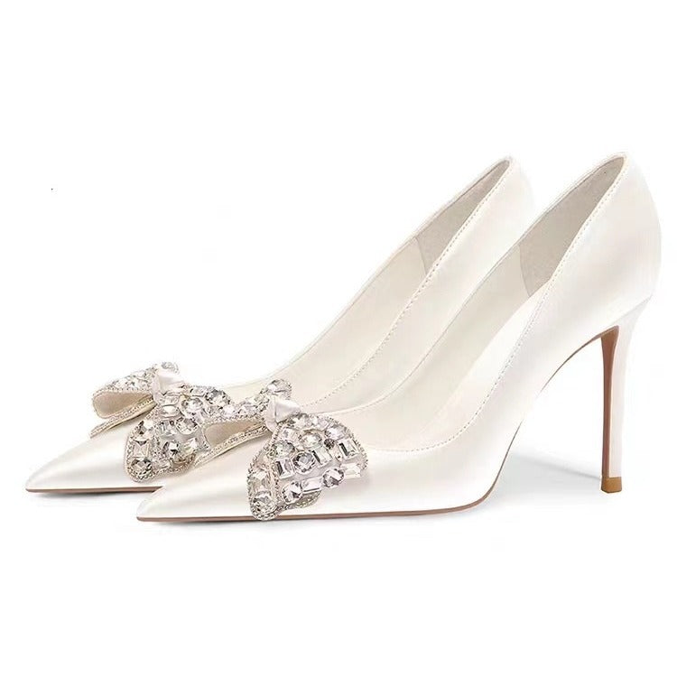 Luxurious satin high heel embellished with sparkling crystal bows on a sleek pointed toe - perfect for sophisticated elegance or glamour.