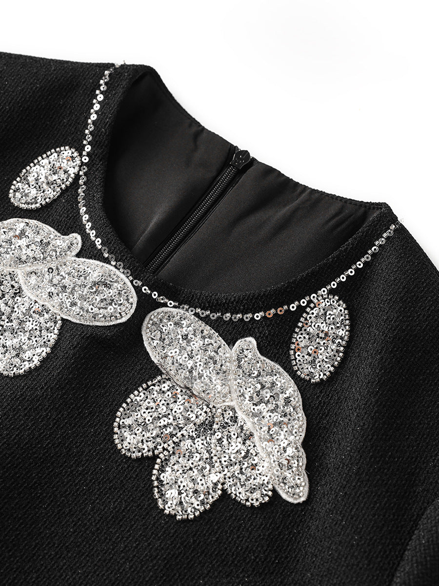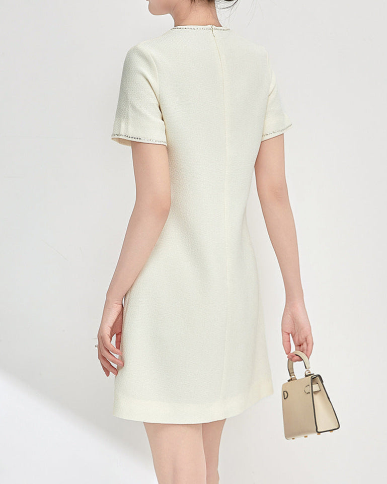 An elegant and sophisticated short-sleeved dress featuring dazzling floral crystal embroidery along the neckline and delicate pearl-embellished pockets. A timeless piece.