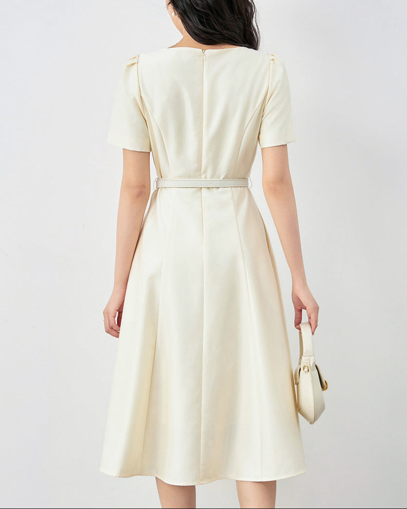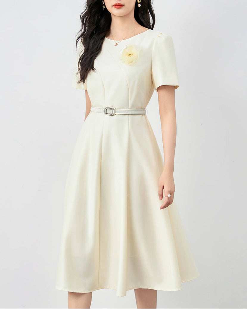 This elegant midi dress features a soft A-line silhouette, delicate floral embroidery on the chest, and a thin belt that accentuates the waist. Perfect for blending charm and sophistication in every detail.