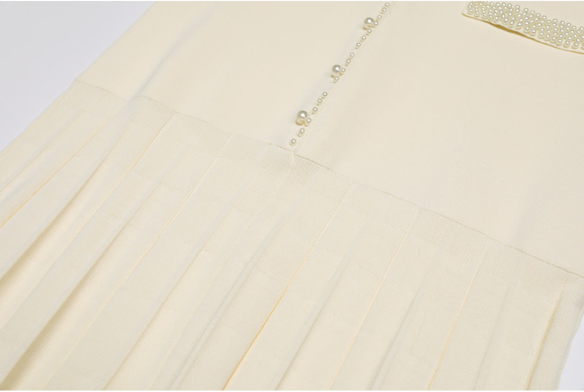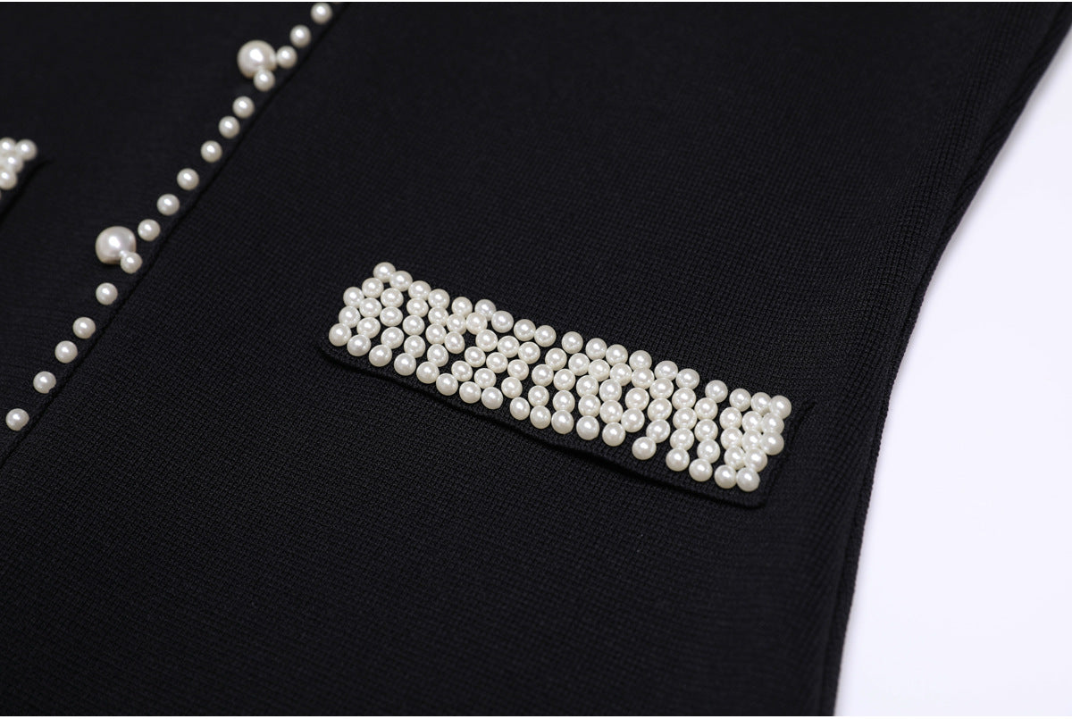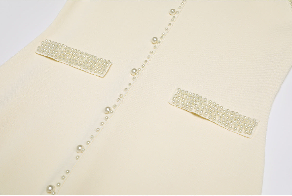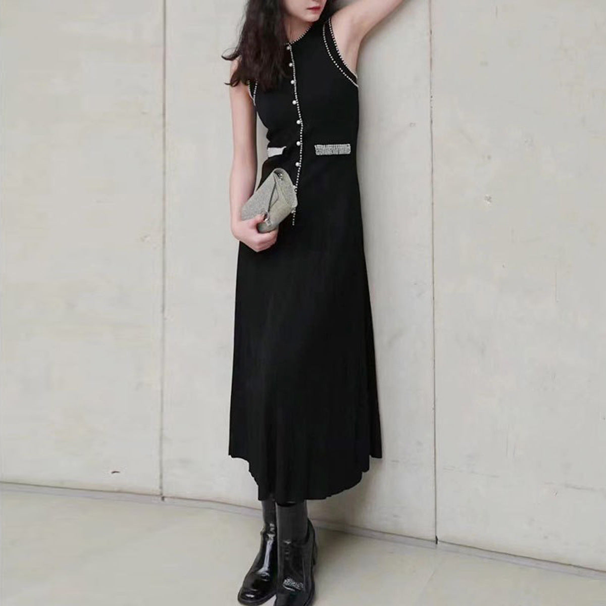 Elegant sleeveless knit dress featuring pearl-trimmed buttons, pleated skirt detailing, and decorative pocket accents. A timeless piece blending sophistication and modern minimalism. Fabric name: viscose fiber Size Bust (cm) Waist (cm) Hips (cm) Shoulder (cm) Length (cm) Sleeve (cm) 2Xs 82 76 98 — 128 — Xs 86 80 102 — 129 — S 90 84 106 — 130 —