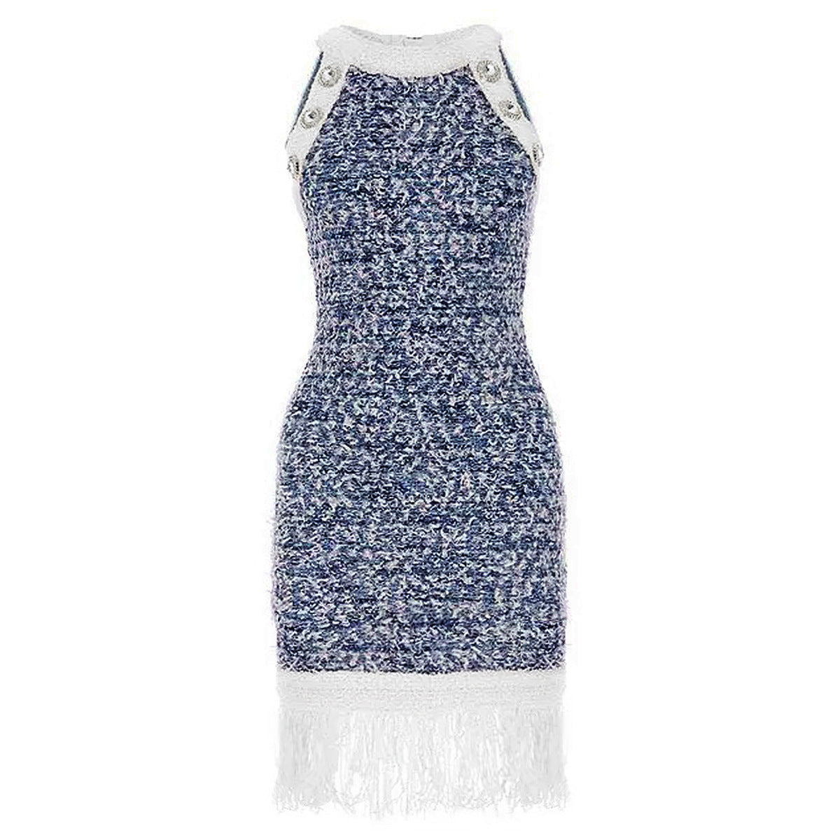 Chic sleeveless tweed mini dress detailed with buttoned shoulder straps and a playful fringe hem. A flattering fitted silhouette that blends elegance with a modern twist.