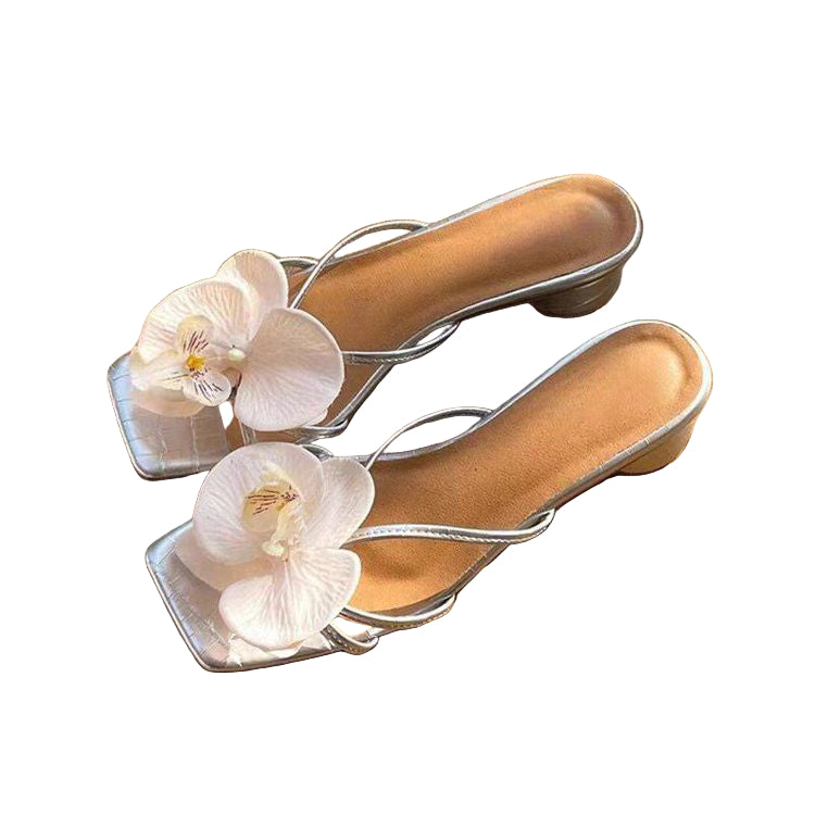 Chic square-toe sandals featuring delicate orchid flower embellishments, slender straps, and a comfortable low block heel. A feminine and elegant choice to add floral charm to your outfits. Upper material: PU Sole material: rubber
