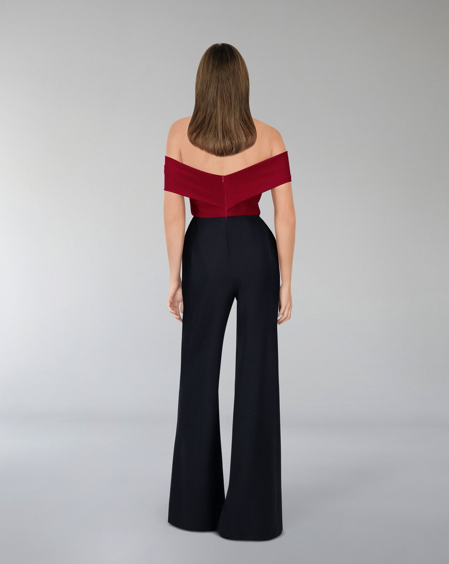 Striking jumpsuit with a deep crimson off-shoulder bodice, artfully pleated for a flattering fit, paired with sleek black wide-leg trousers for a bold, modern contrast.