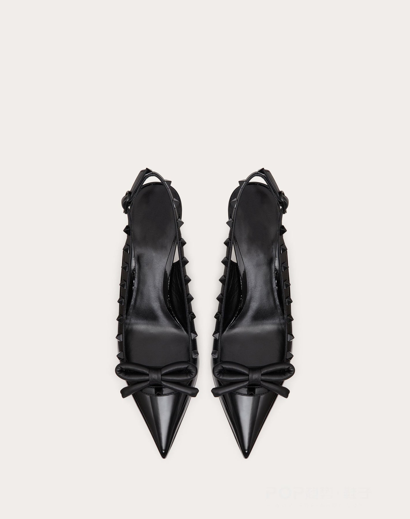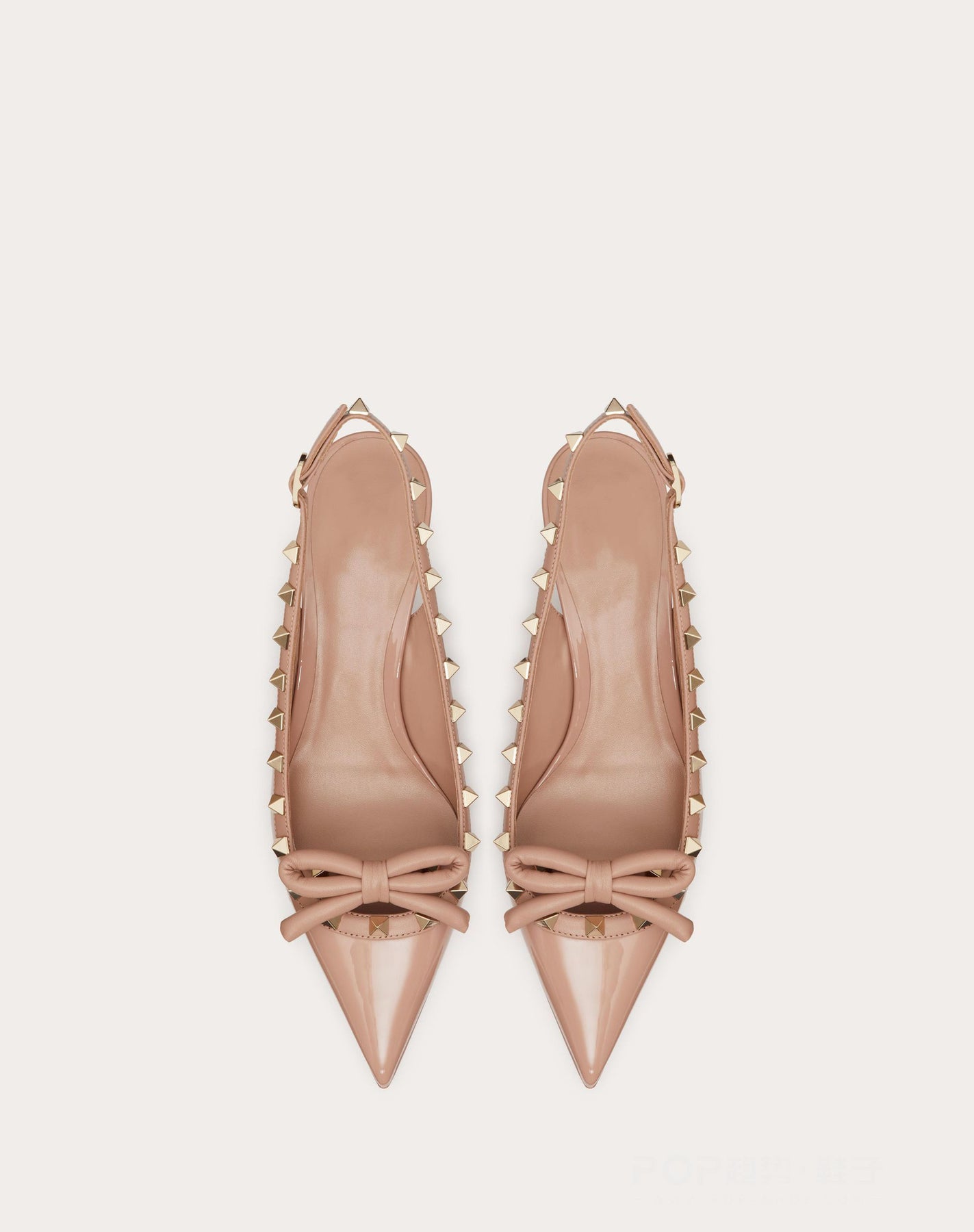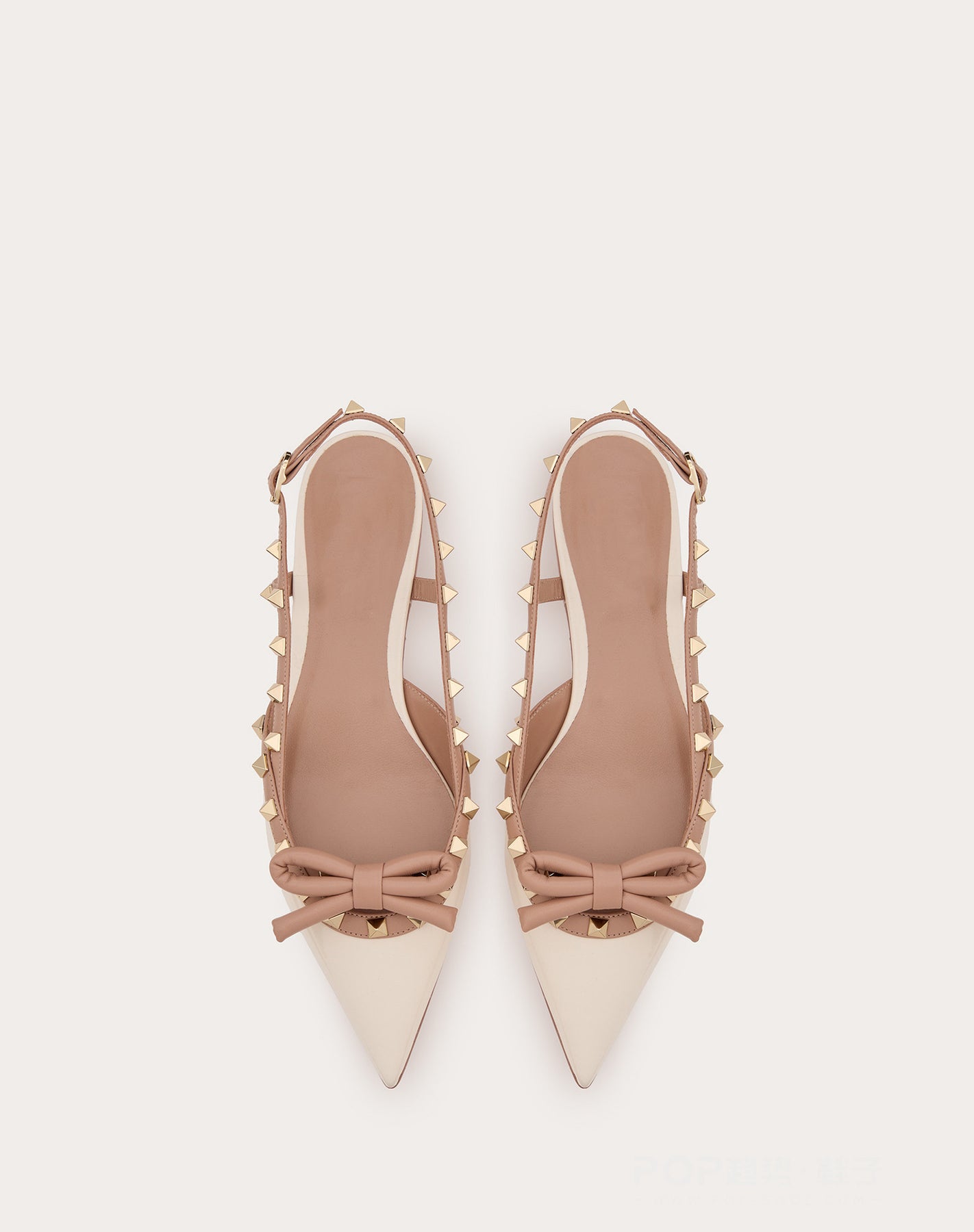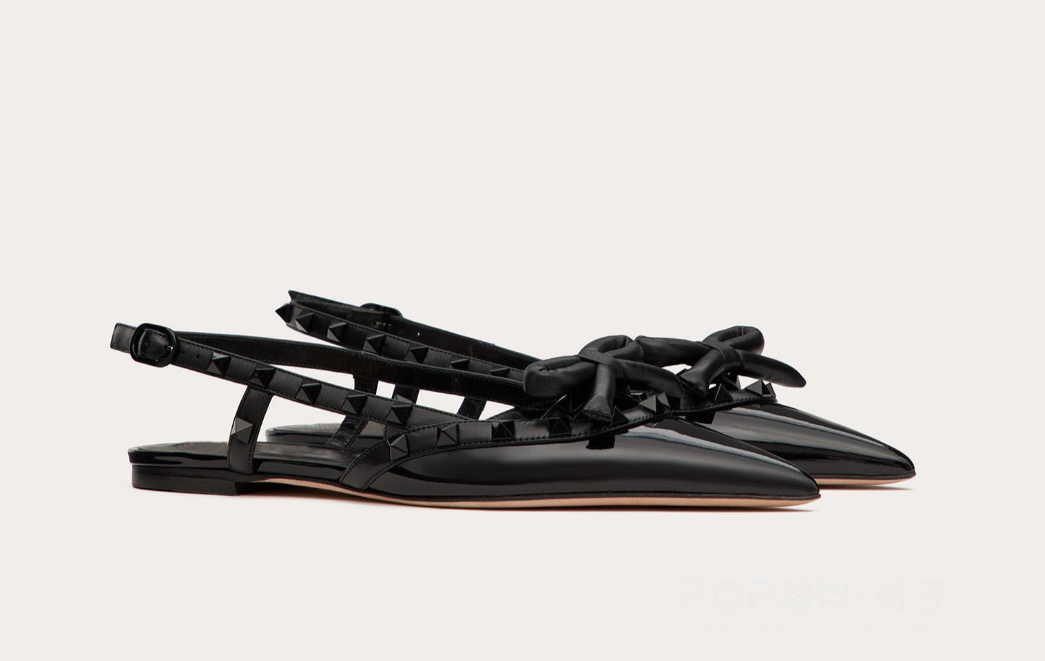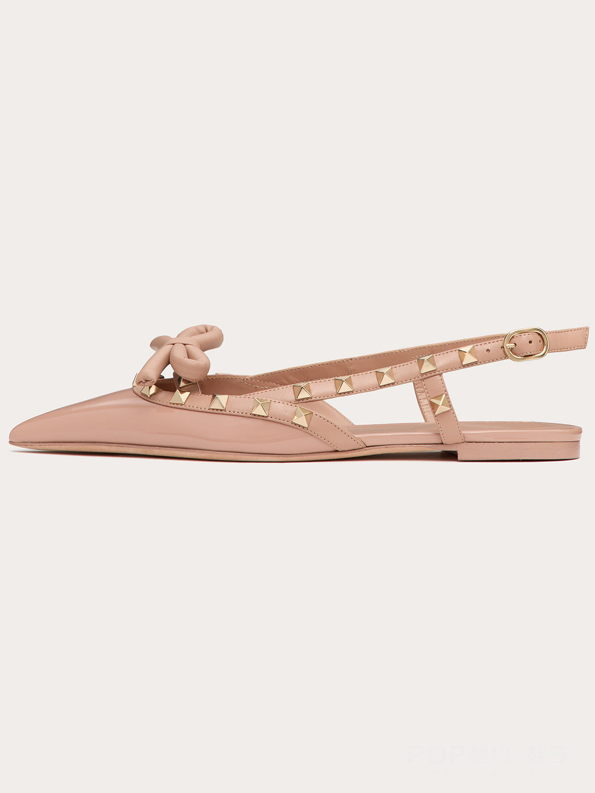 Chic pointed flats featuring delicate bow accents and studded straps combine elegance and edge for a touch of sophistication.