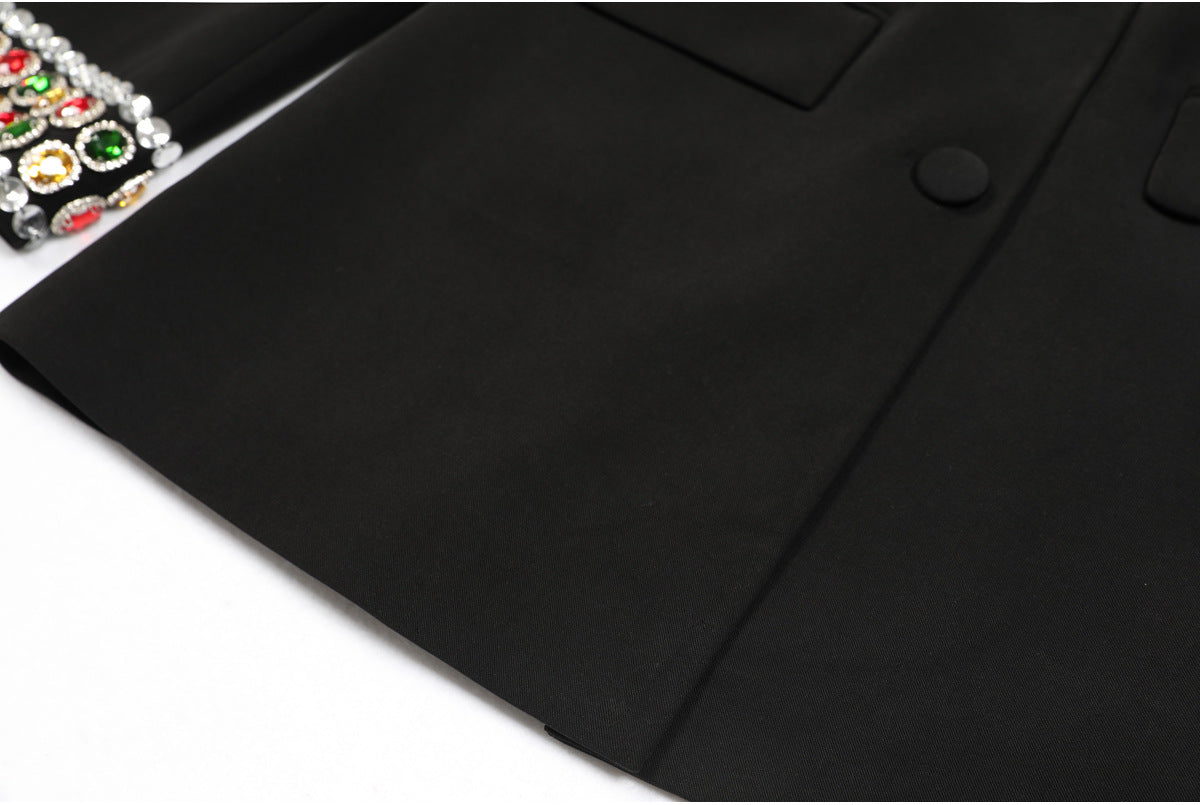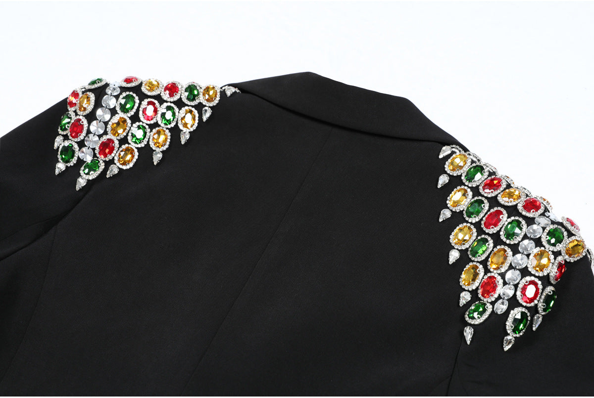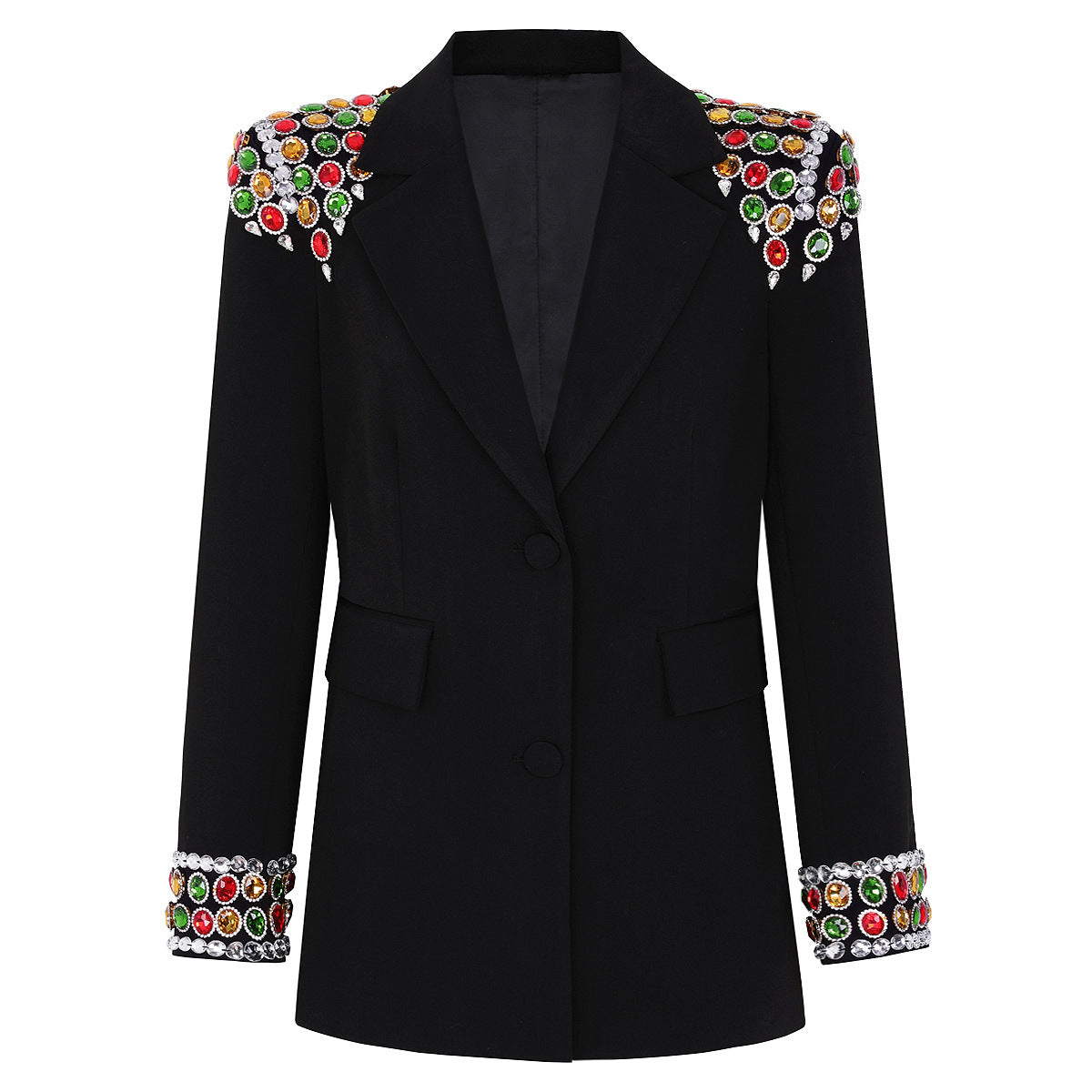 An elegant black jacket embellished with multicolored jeweled embellishments on the shoulders and sleeves. A bold and luxurious piece, designed to add a touch of elegance to any chic look with its dazzling details. Fabric name: Nylon Size Bust (cm) Waist (cm) Shoulder (cm) Length (cm) Sleeve (cm) S 90 82 39 70 59 M 94 86 40 71 60 L 98 90 41 72 61 XL 102 94 42 73 62 2XL 106 98 43 74 63