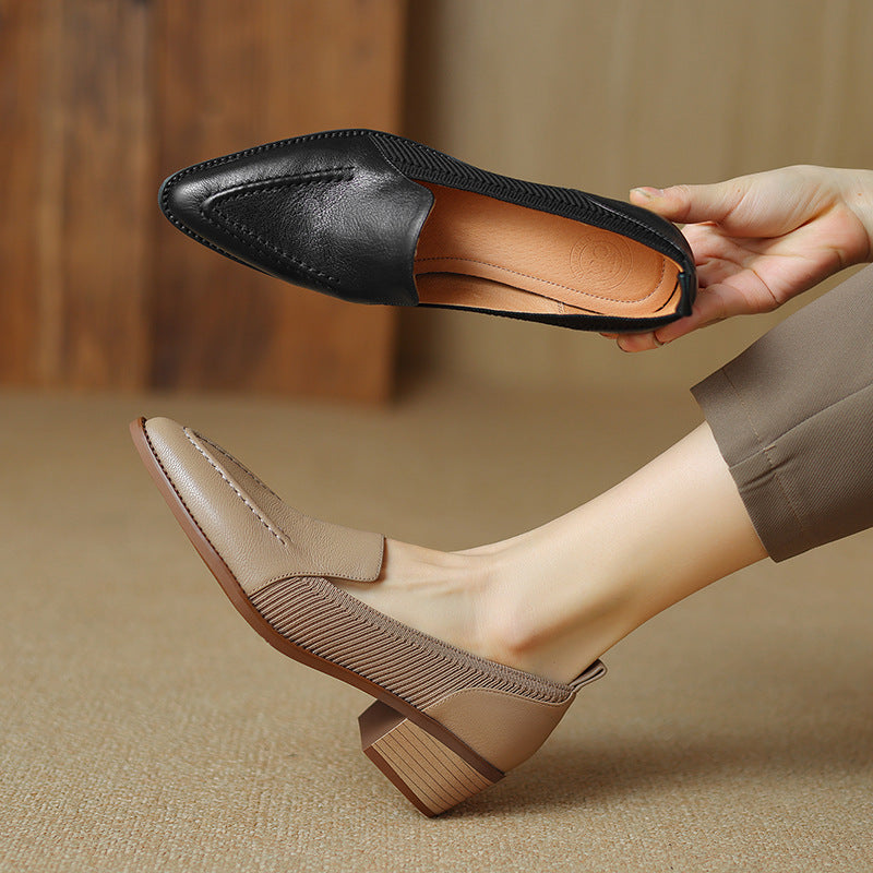 Chic and comfortable, these taupe loafers combine smooth leather with flexible knit sides for a refined yet breathable fit. Designed with a stacked block heel, they’re ideal for effortless transitions from office hours to after-work outings.