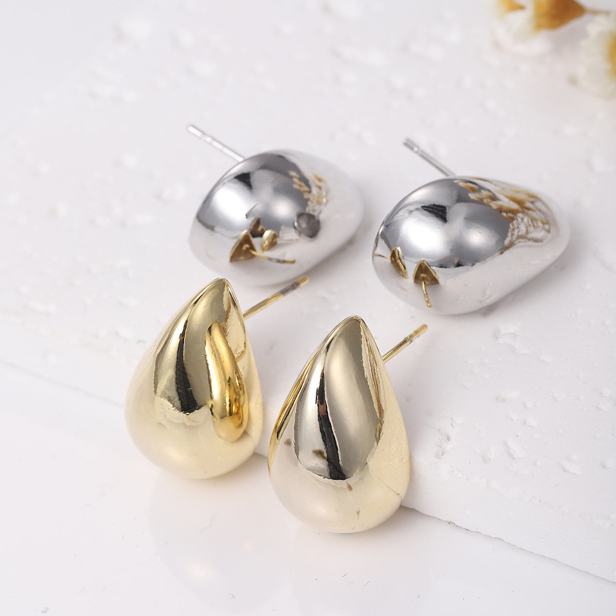 A modern duo of metallic earrings. Featuring a bold teardrop design and a polished finish, these earrings come in gleaming gold and elegant silver tones. Their streamlined, sculptural design makes them ideal for simple looks with a distinctive touch. Lightweight yet eye-catching, they're the perfect choice for both daytime elegance and evening glamour.