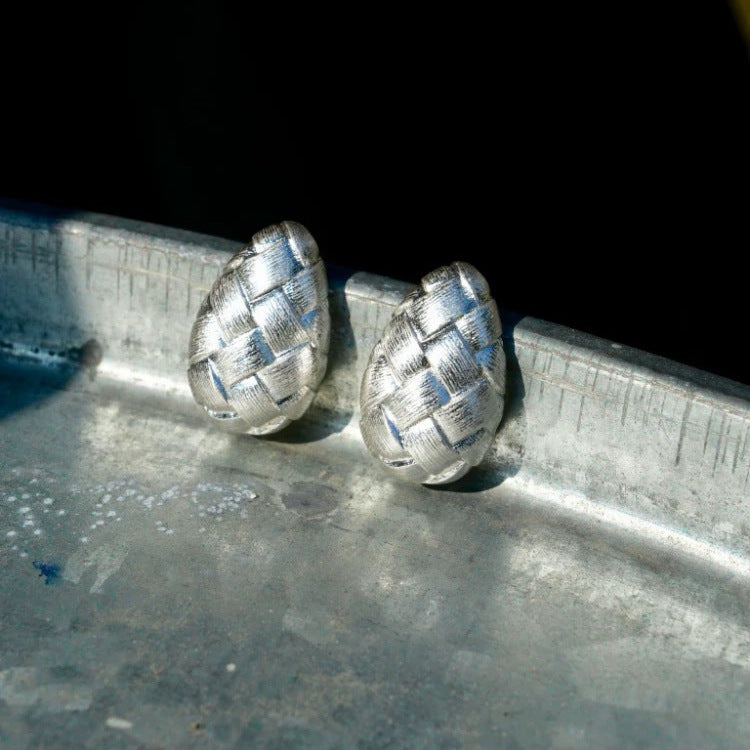 Unique teardrop-shaped stud earrings featuring a woven metallic texture that blends elegance with bold design. Perfect for adding a touch of modern sophistication to your looks. Material: Metal