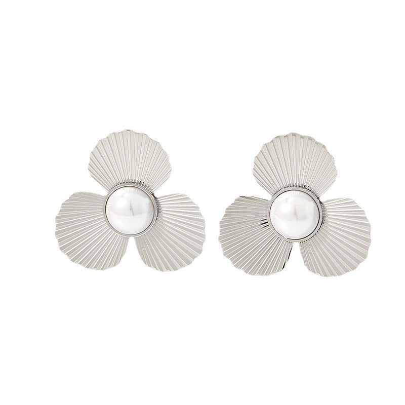 Ornate floral earrings with three delicately embellished petals surrounding a sparkling faux pearl center. Available in gold and silver, these distinctive earrings expertly combine timeless charm with a modern touch, perfect for everyday looks and special occasions.
