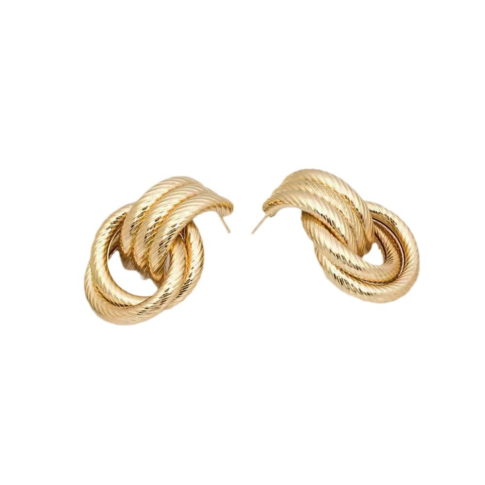These elegant earrings feature a luxurious twisted rope design crafted into interlocking loops, creating a bold yet timeless statement. The intricate texture and gleaming gold-tone finish add depth and sophistication, making them perfect for both daywear and special occasions. A modern take on classic hoop earrings, these are ideal for elevating any outfit with a touch of vintage glamour.