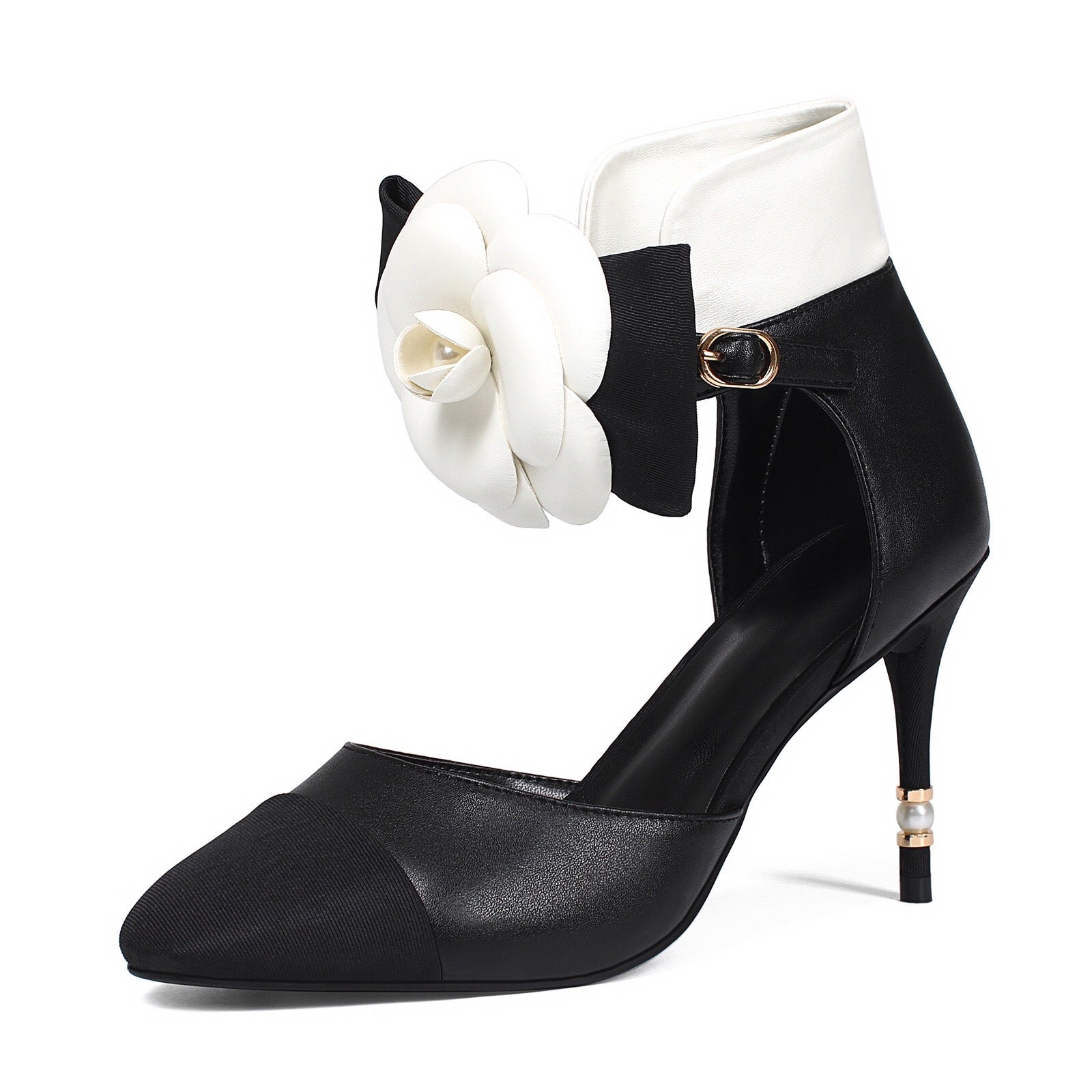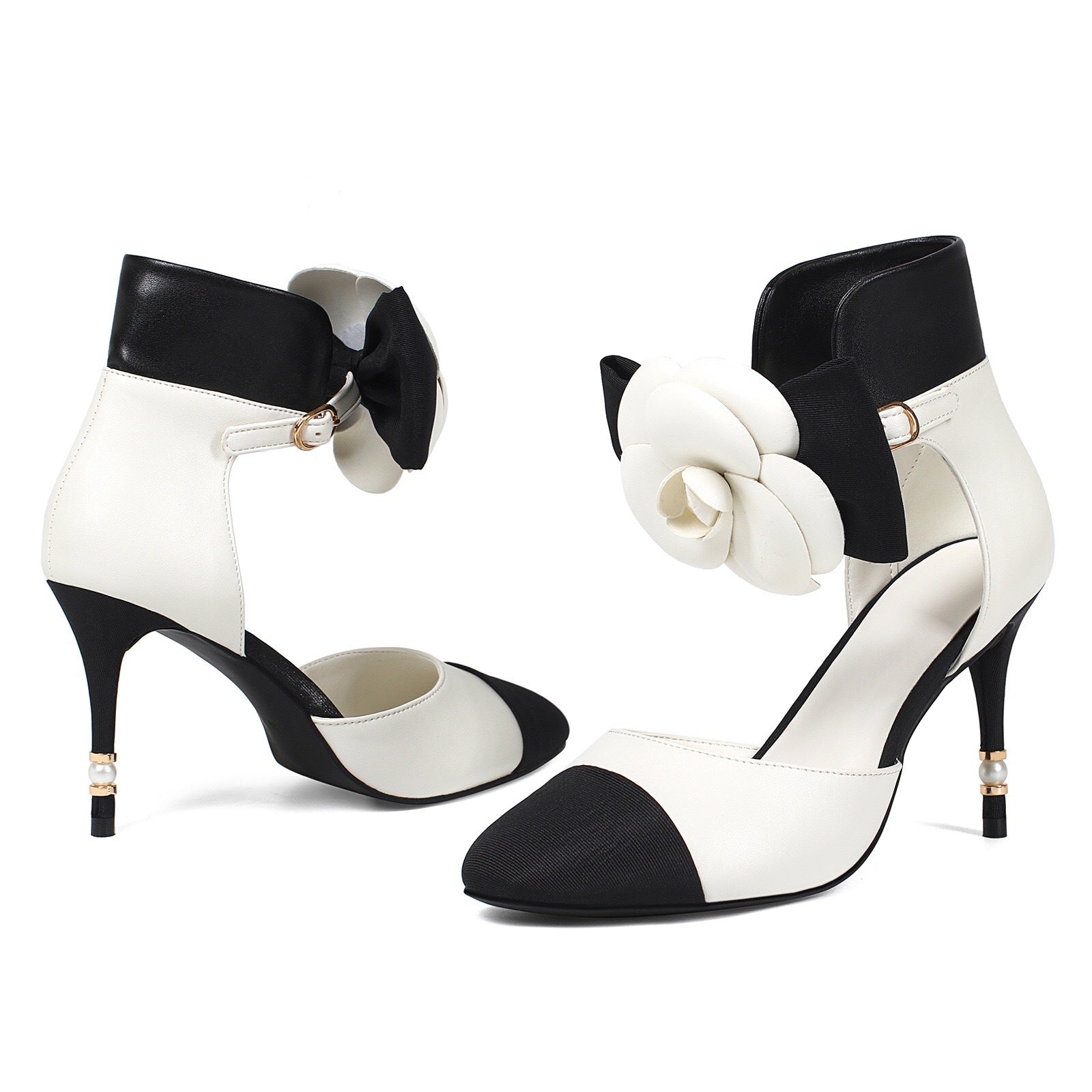 Sophisticated beige and black heels featuring a pointed toe, delicate ankle strap, and oversized camellia flower detail. Finished with a pearl-adorned stiletto heel for a timeless feminine touch.