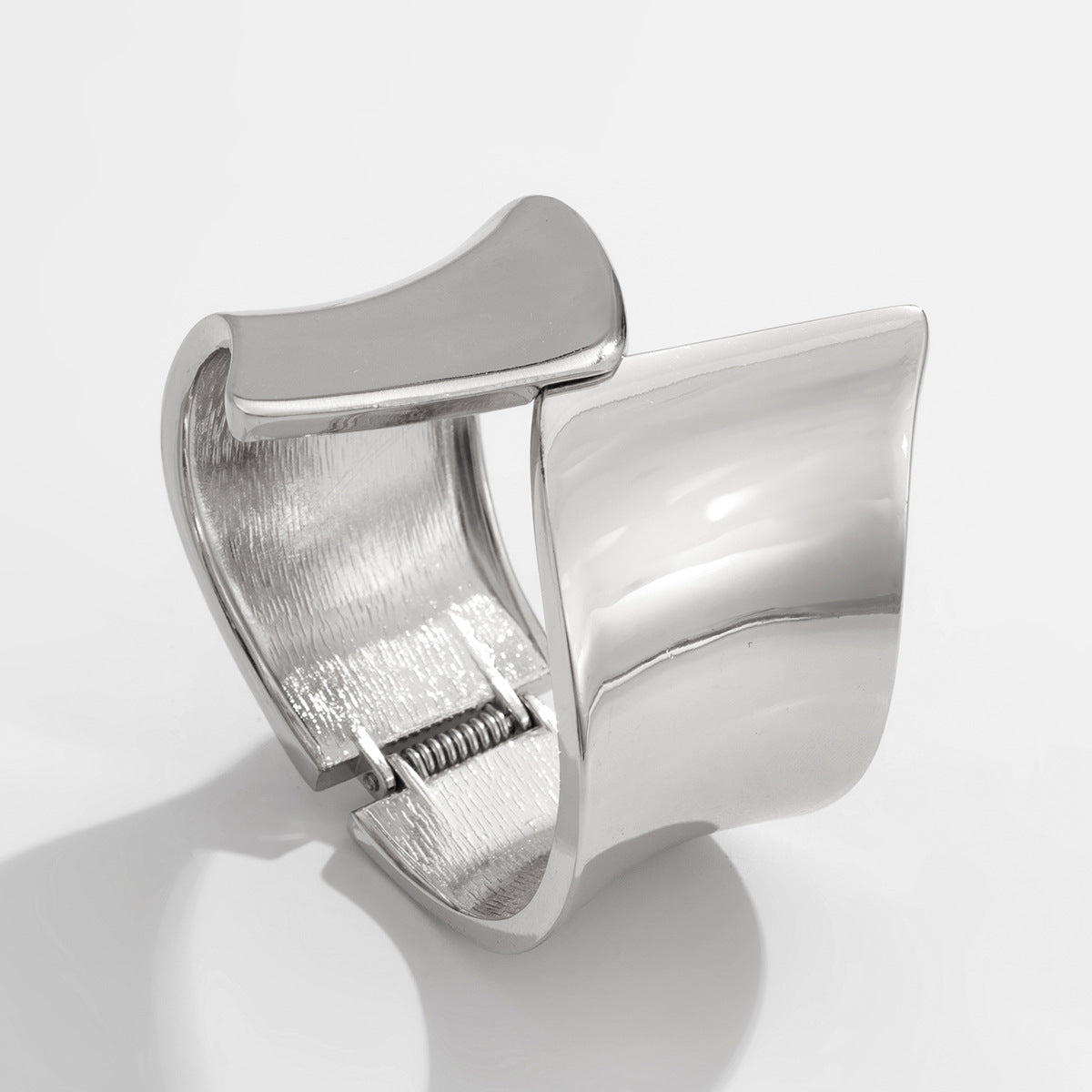 A wide, sculpted bracelet with an elegant asymmetrical closure. Its sleek design and sheen add a contemporary touch to any look, seamlessly blending elegance and modernity. Available in gold and silver tones for a versatile look.