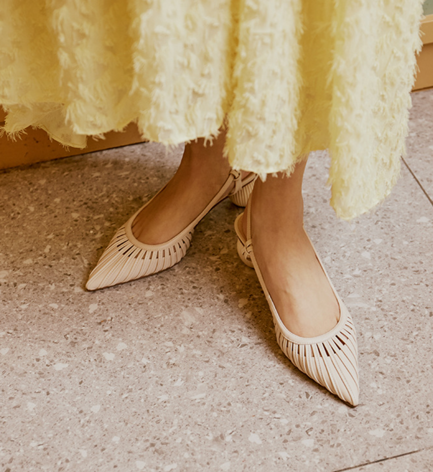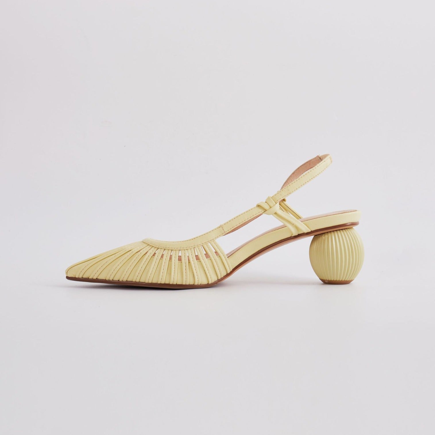 Elegant pastel-toned slingback pumps featuring pleated textures and sculptural ribbed sphere heels. A contemporary take on classic femininity—perfect for stylish daytime or artistic evening looks.