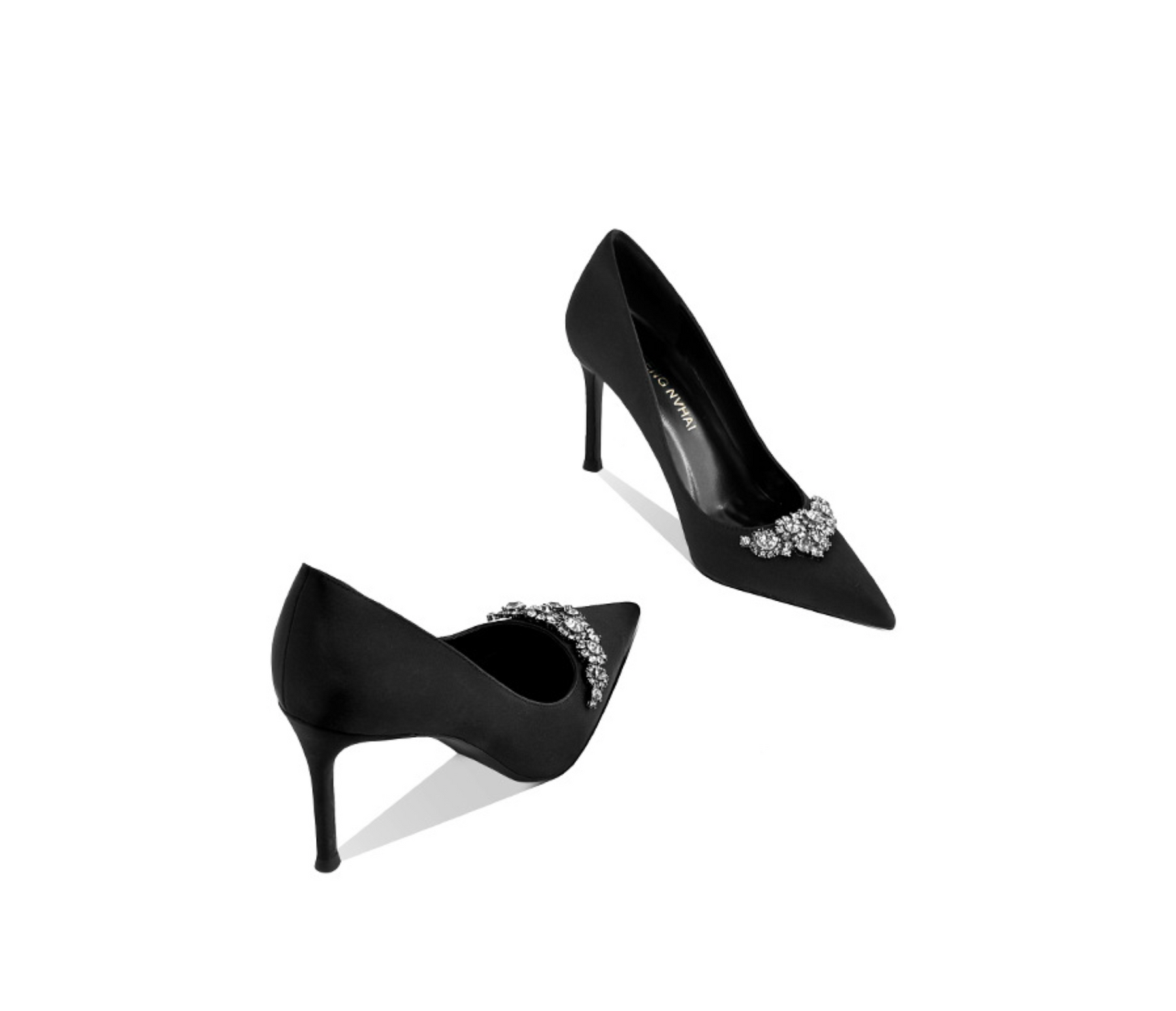 Elevate your elegance with these luxurious black satin pumps, featuring a sleek pointed toe for a refined silhouette. The delicate crystal embellishment adds a touch of glamour, making them perfect for evening events, weddings, or upscale occasions. Designed with a comfortable mid-height stiletto heel, these pumps offer both style and sophistication. The soft satin finish enhances their timeless appeal, ensuring they complement a wide range of outfits, from elegant dresses to tailored ensembles.